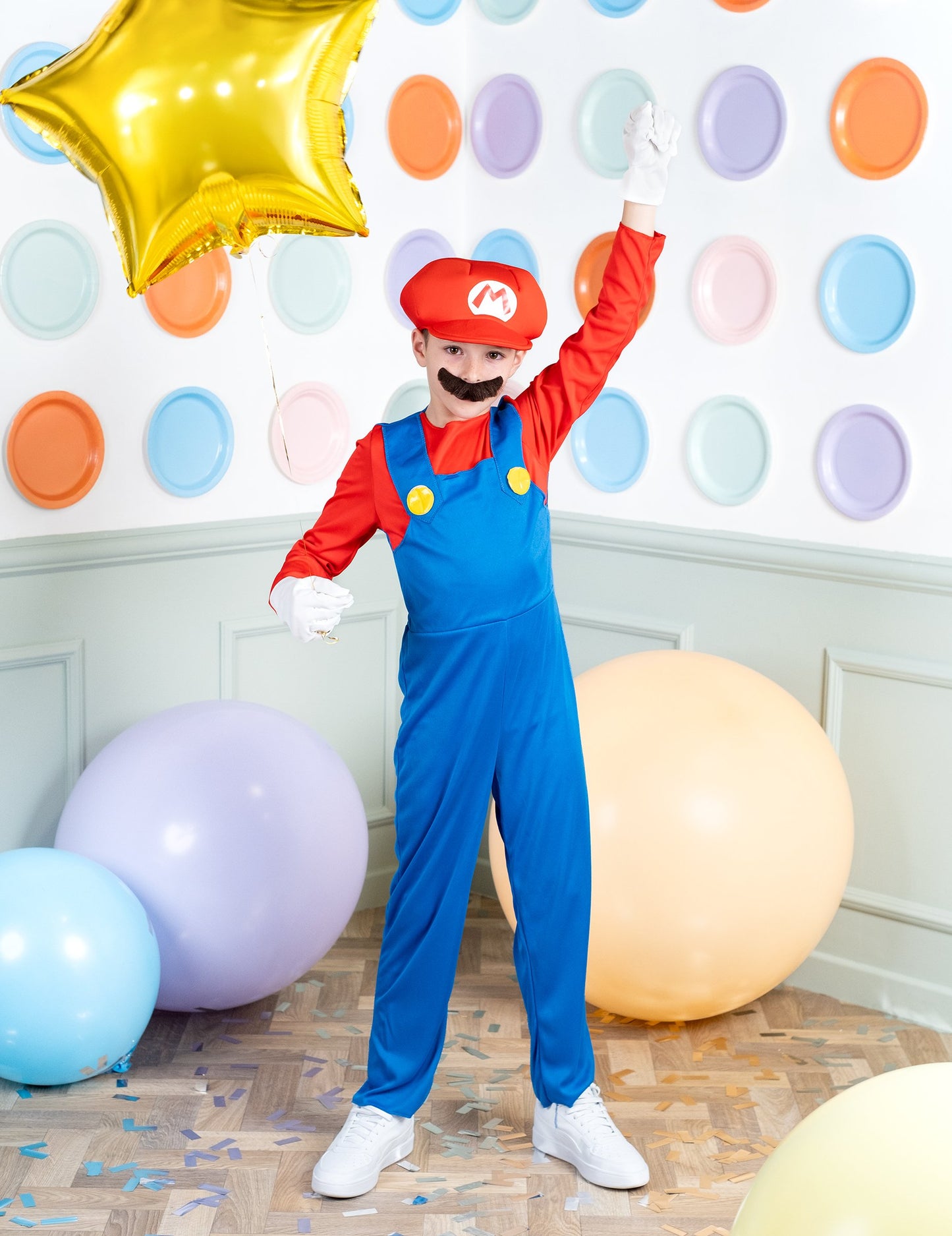 Ez a Mario gyermek jelmez hivatalos Mario engedély alá tartozik. Kombinációból, kalapból és hamis bajuszból áll Mario -tól. A hosszú, lassú kombináció a Mario híres kék és piros vízvezeték -szerelőjét képviseli. Két sárga műanyag kör ábrázolja a kezeslábak BIE -jét. A kombináció tökéletesen alkalmazkodik a méretéhez, köszönhetően a méretben lévő rugalmasságnak. A Super Mario piros sapkája habból készül. A kupak elején egy fehér kör közepén egy "M" van. A Mario Ragasztó nagy bajusza sötétbarna szintetikus szőrszálakban van. Ez a Mario jelmez tökéletes lesz, hogy új kalandokat keressen egy parti alkalmával a videojátékok témájáról, vagy pedig a karnevál idején Super Mario Bros -ként álcázza magát.