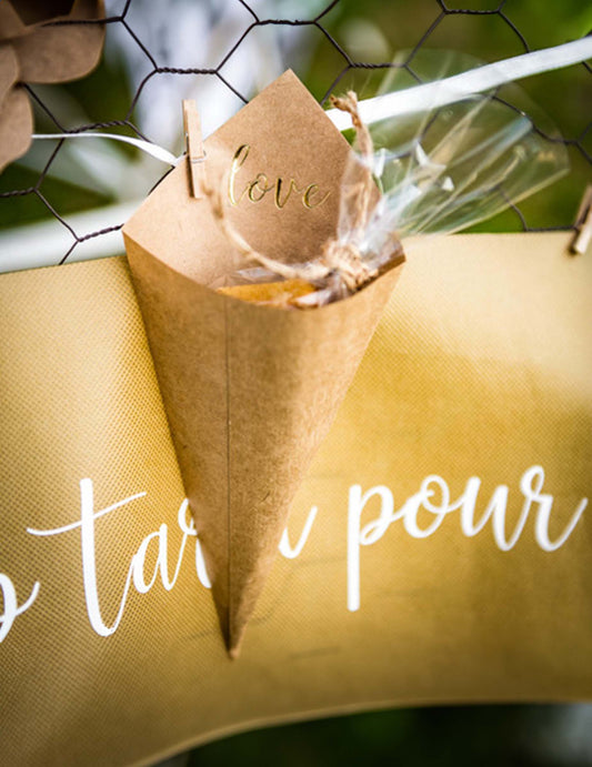 Elfogyott10 kraftpapír kúp dombornyomott arany betűkkel, "szerelem" mintával, 20 x 11 cm esküvőre