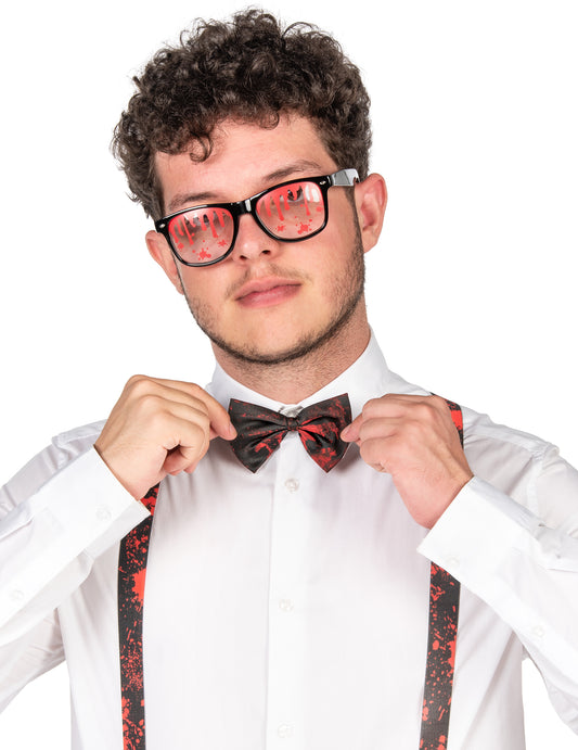 Felnőtt véres fekete kiegészítők készletTartalmazza: 1 pár harisnyatartó, 1 csokornyakkendő, 1 pár szemüveg 4.000 Ft4.000 Ft
