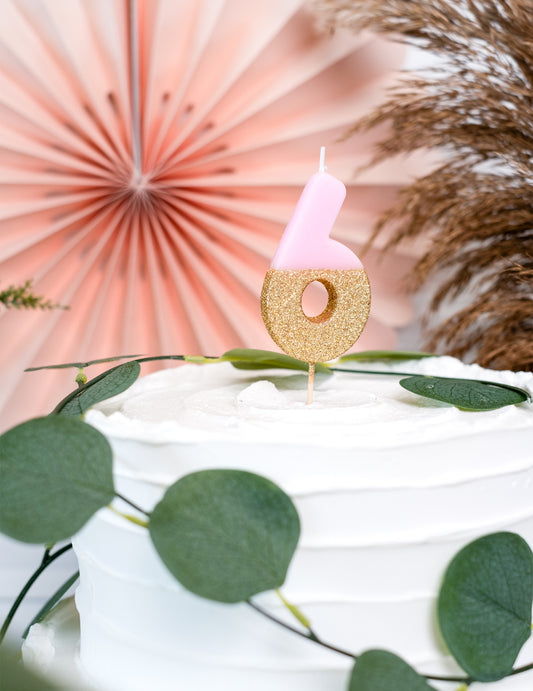 Elfogyott6-os számú rózsaszín és arany csillámos gyertya pálcikán, 13.8 cm tortához