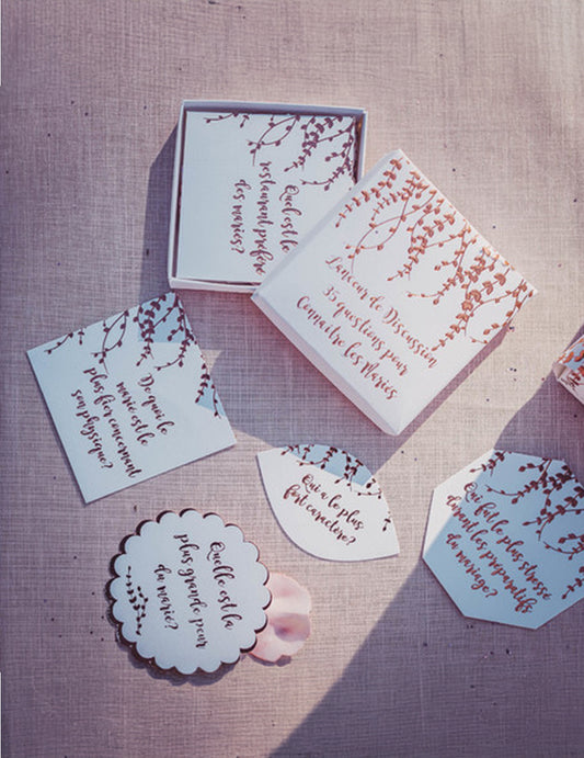 Elfogyott35 db rozéarany színű, növényi alapú beszélgetésindító kártya, 7 x 7 cm esküvői szórakoztatáshoz