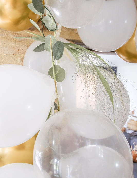 60 darabos fehér és arany lufi ívkészlet eukaliptusz levelekkel