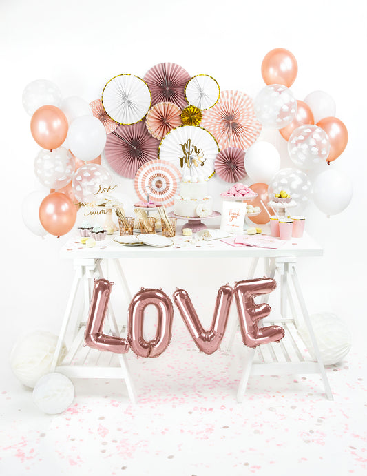70 rózsa arany léggömbből készült bárkészlet eukaliptusz és rózsaszín