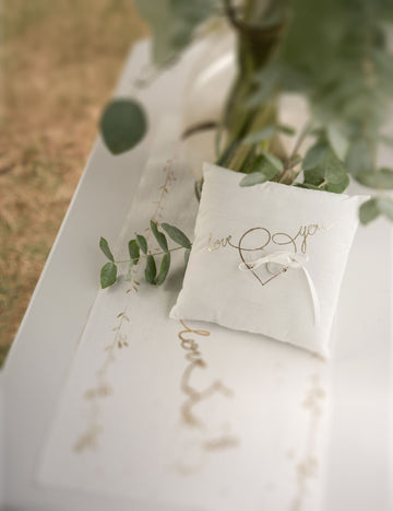 ElfogyottFehér és arany "Szeretlek" gyűrűpárna, 18 x 18 cm pamut