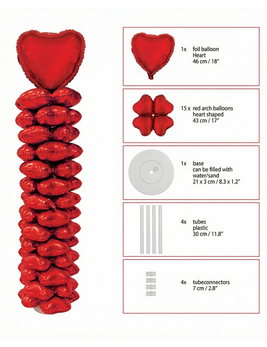 Tartalmazza: 1 szív alakú lufi , 15 szív alakú lufi kör , 1 bázis , 4 cső csatlakozókkal