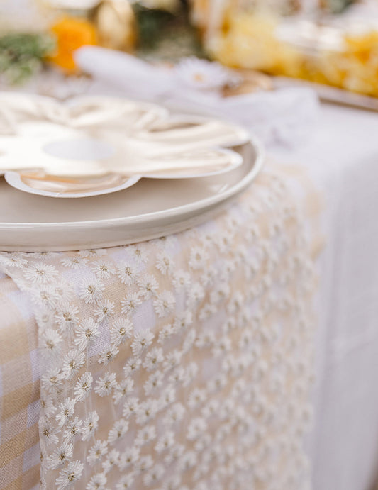Hímzett fehér és arany voile asztali futó, 24cm x 3m, virágokkal