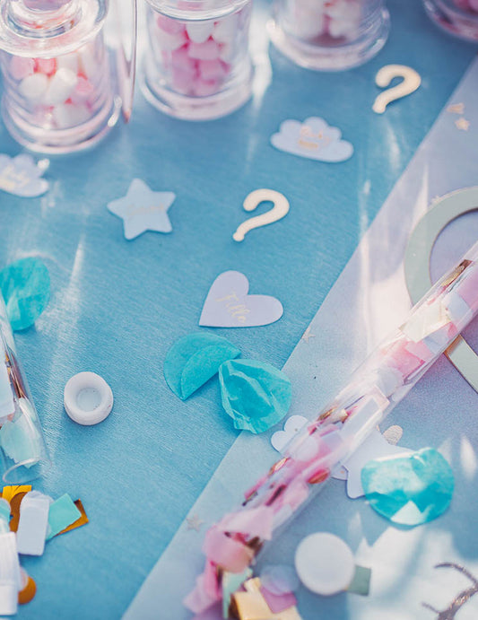 100 rózsaszín, kék és arany konfetti lány vagy fiú nemének felfedésére