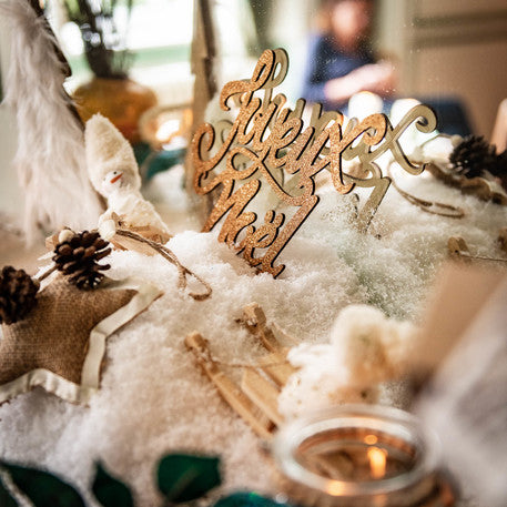 Karácsonyi dísz réz csillámporral, fa, 19 x 20 cm asztalhoz