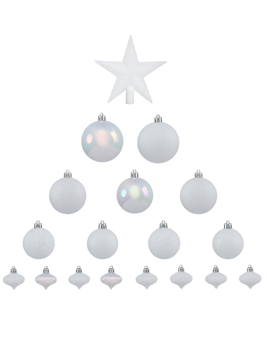 18 darabos fehér karácsonyfadísz készlet gömbdíszekkel és fa tetejével