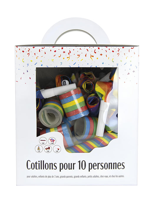 Tartalmazza: 10 sarbacanes, 10 chapeaux, 10 sans gênes, 60 serpentins, 100 boules
