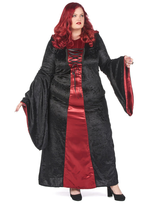 Nagy gótikus méretű jelmez piros és fekete női motorháztetővel