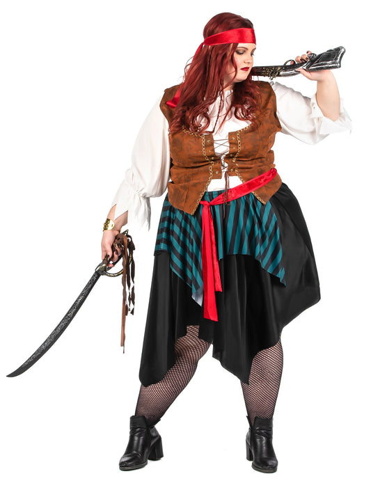 Kék és fekete csíkos kalóz álruhás nagy méretű nő