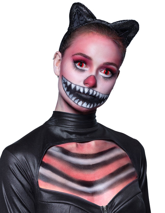 Tartalmazza: 1 Fogsor vámpírfogak, 3 szemhéjfesték: fehér, fekete és piros (3x3g), 1 szivacs, 1 kefe