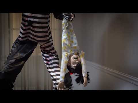 AkcióAnimált dekoráció félelmetes bohóc lógó gyermekkel mozgással és lámpákkal 2,15 m
