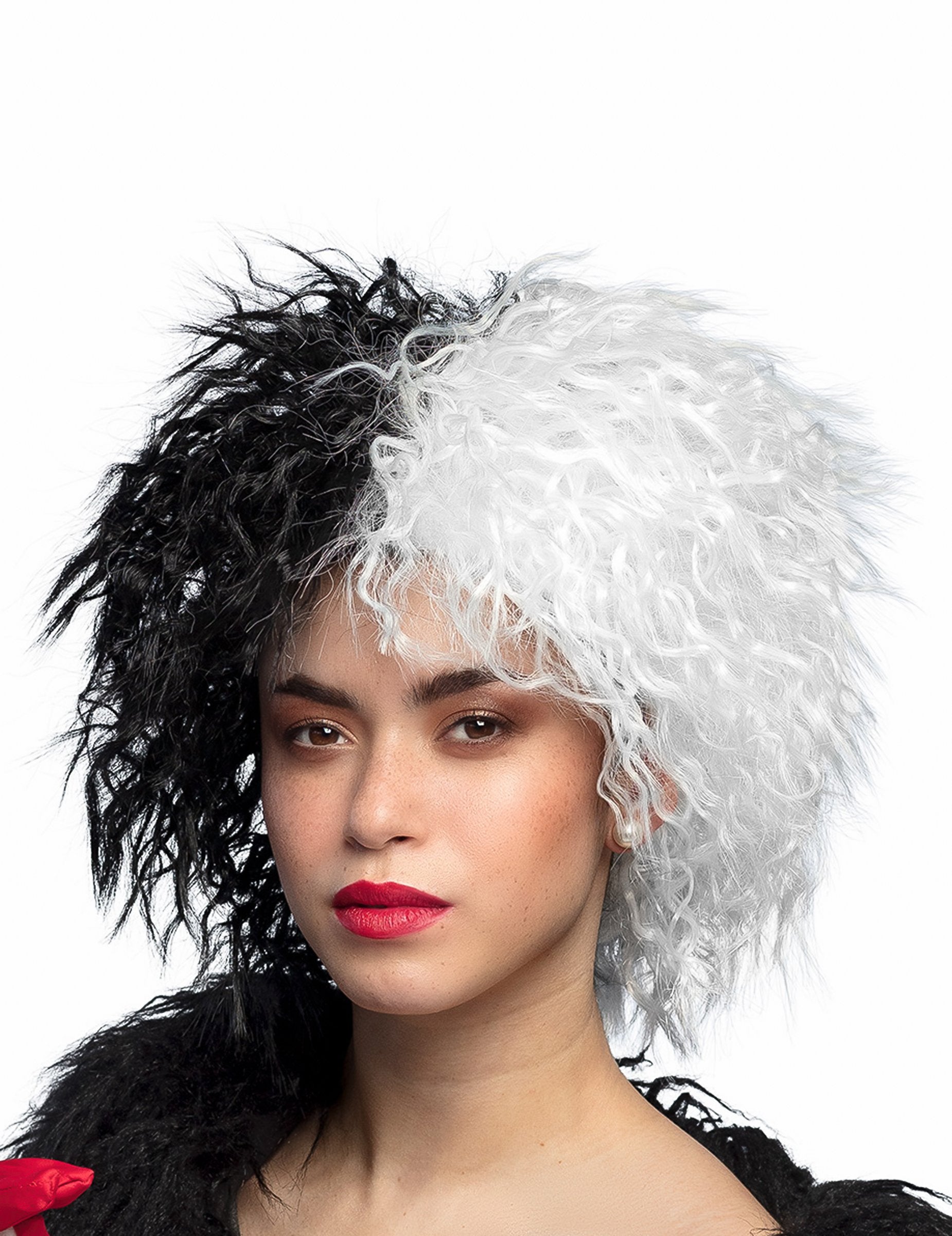 Ez a kegyetlen nő paróka fekete -fehér. Rövid, és a bántalmazott hajának köszönhetően van. Ez ideális lesz a kegyetlen nő álruhájának megtestesítésére és kitöltésére a témájú esténként.