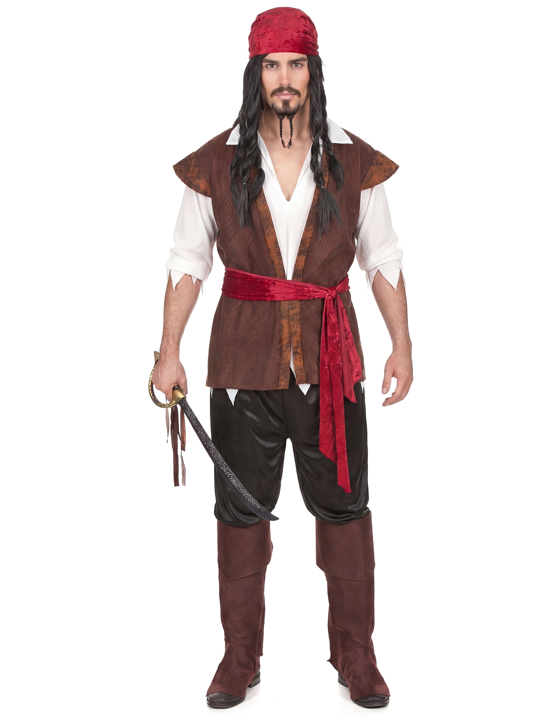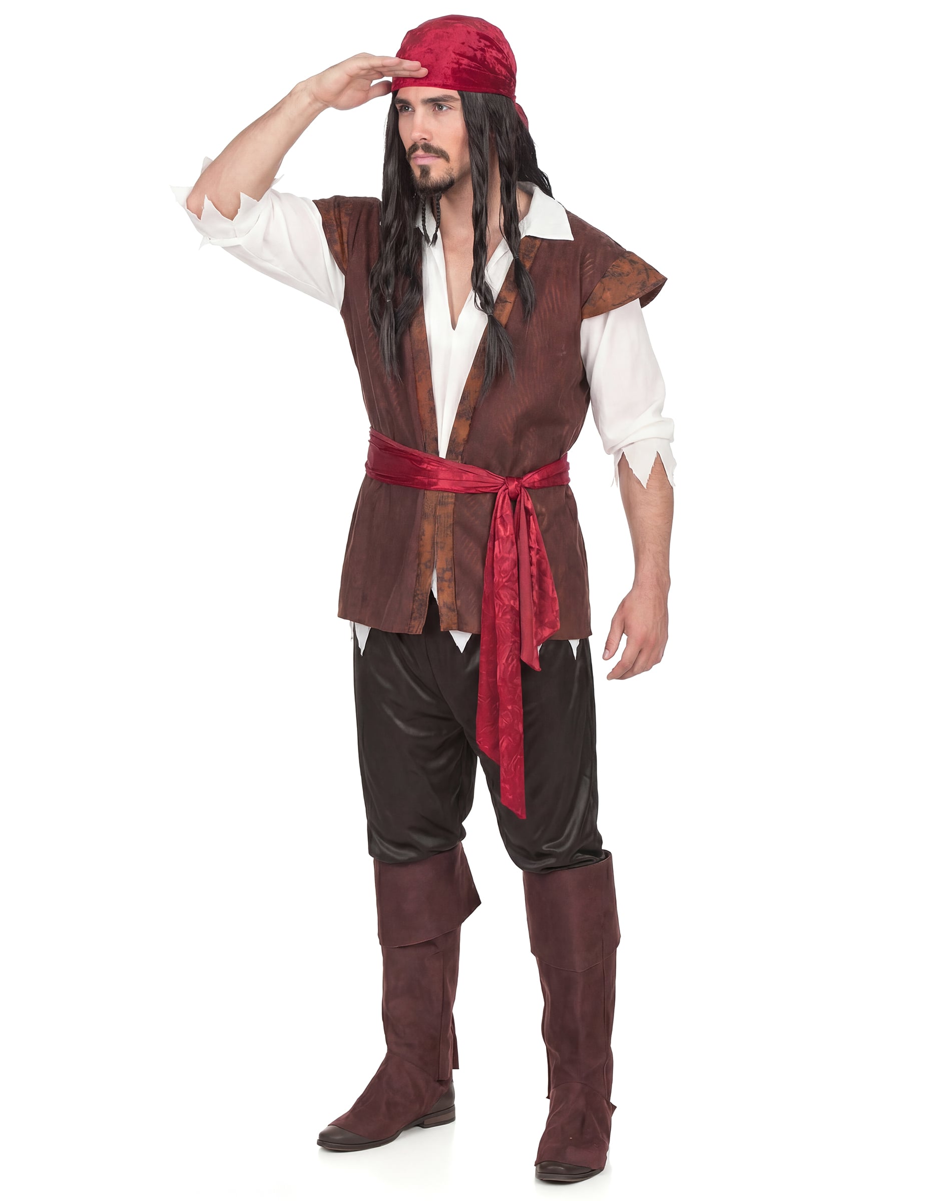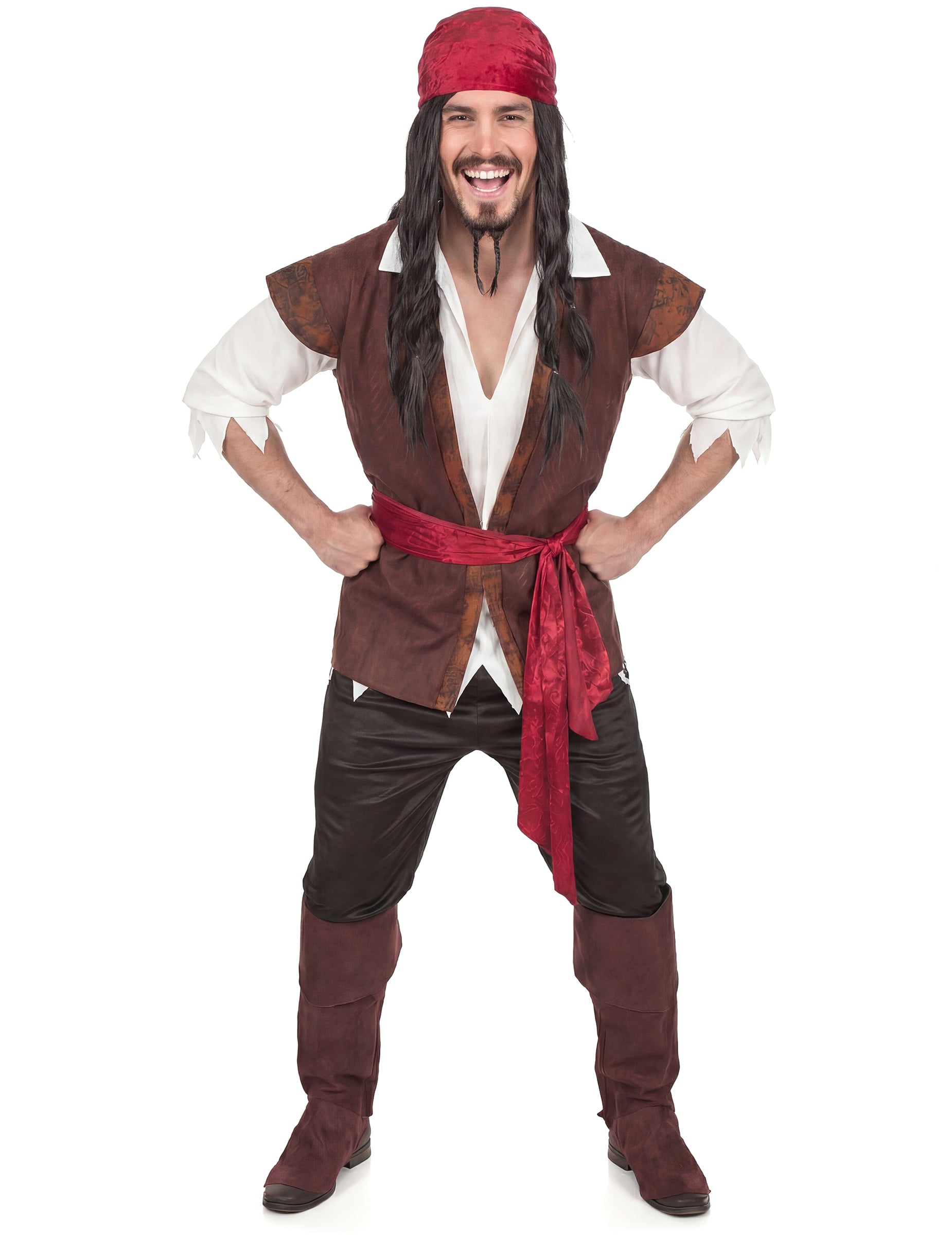 Ez kalóz férfi jelmez magában foglalja a póló az ing és a mellény hatására, amelyek eggyé válnak, egy kendővé, egy capri nadrág, öv és csizmavédő.
