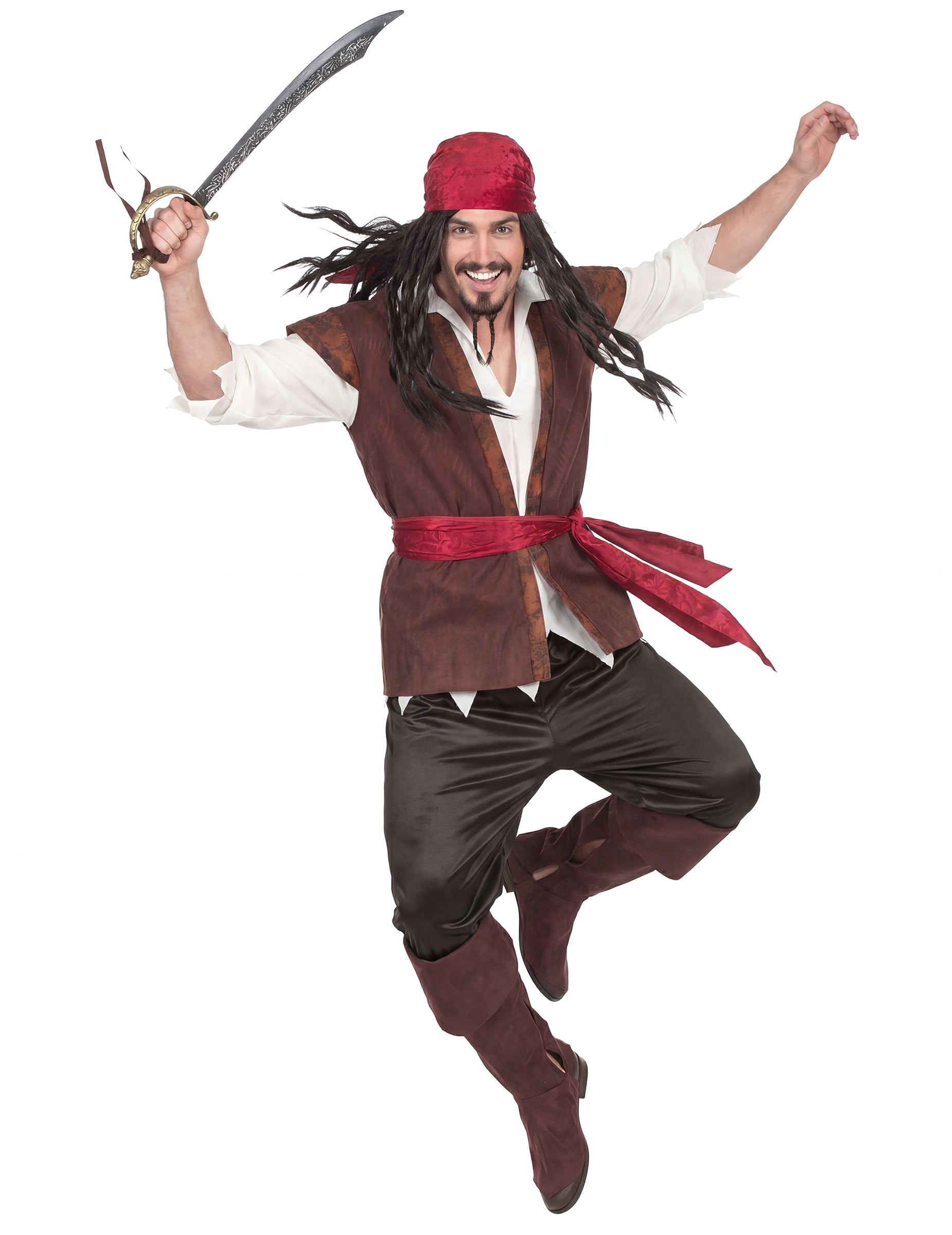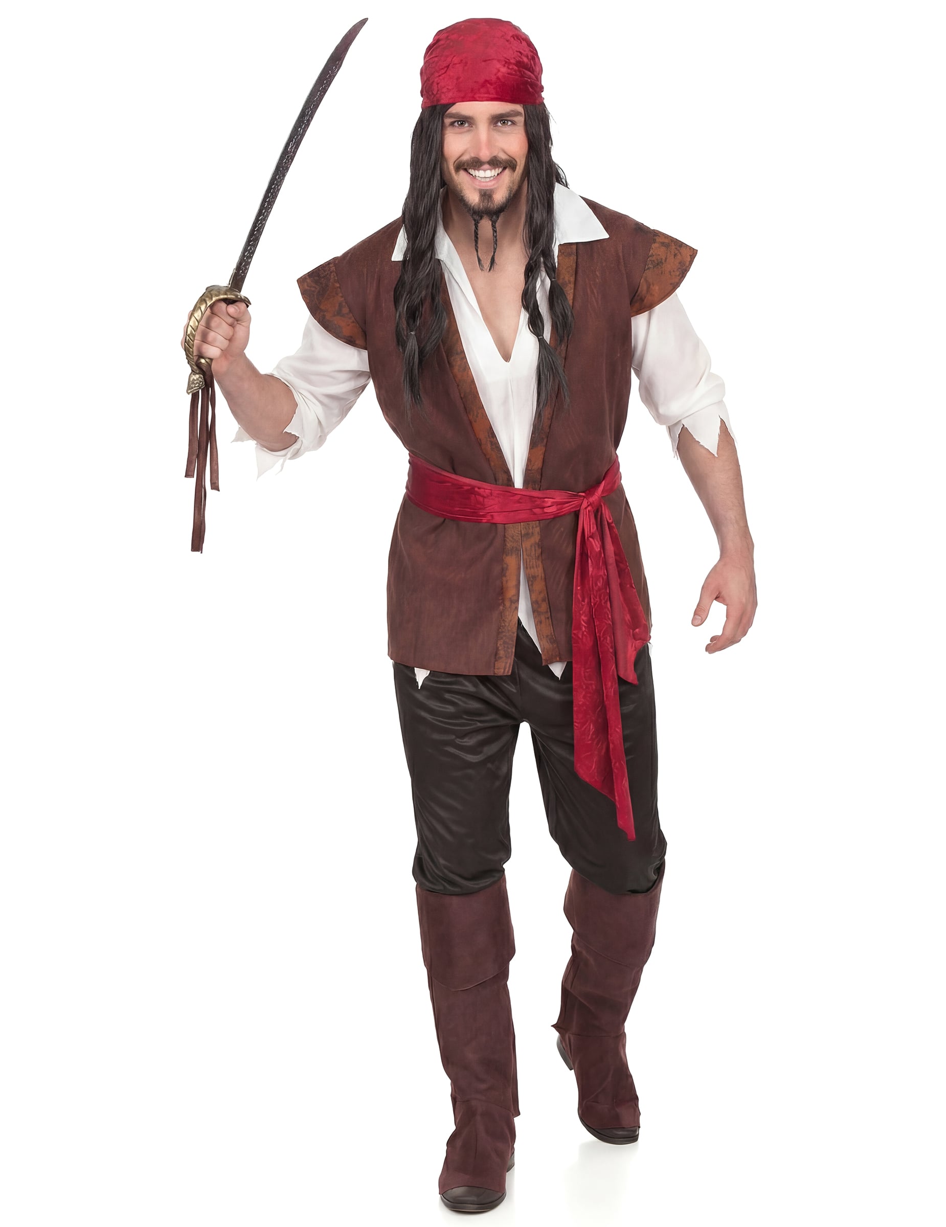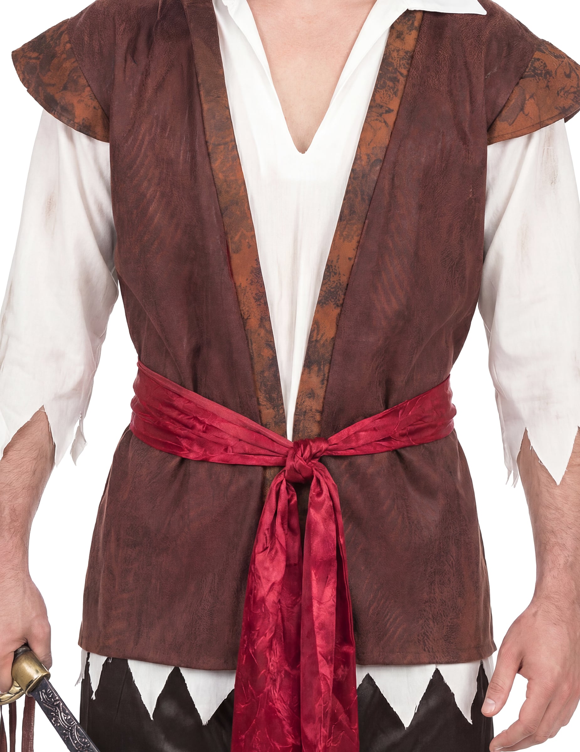 Ez kalóz férfi jelmez magában foglalja a póló az ing és a mellény hatására, amelyek eggyé válnak, egy kendővé, egy capri nadrág, öv és csizmavédő.
