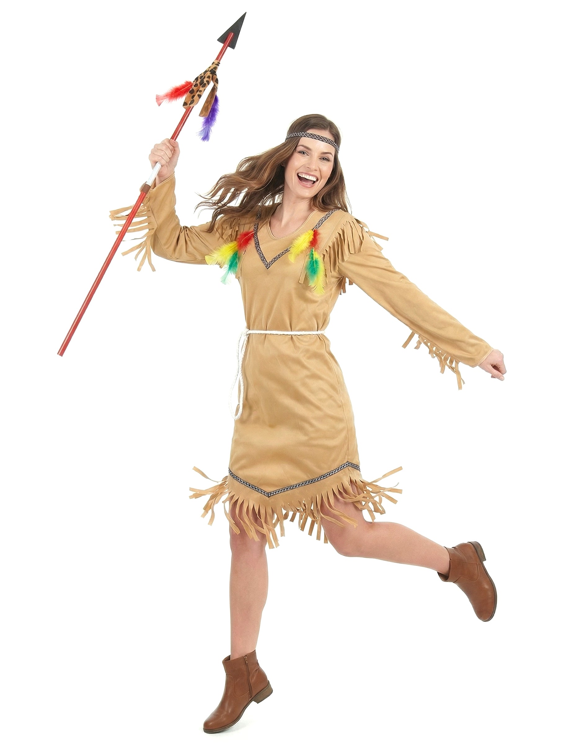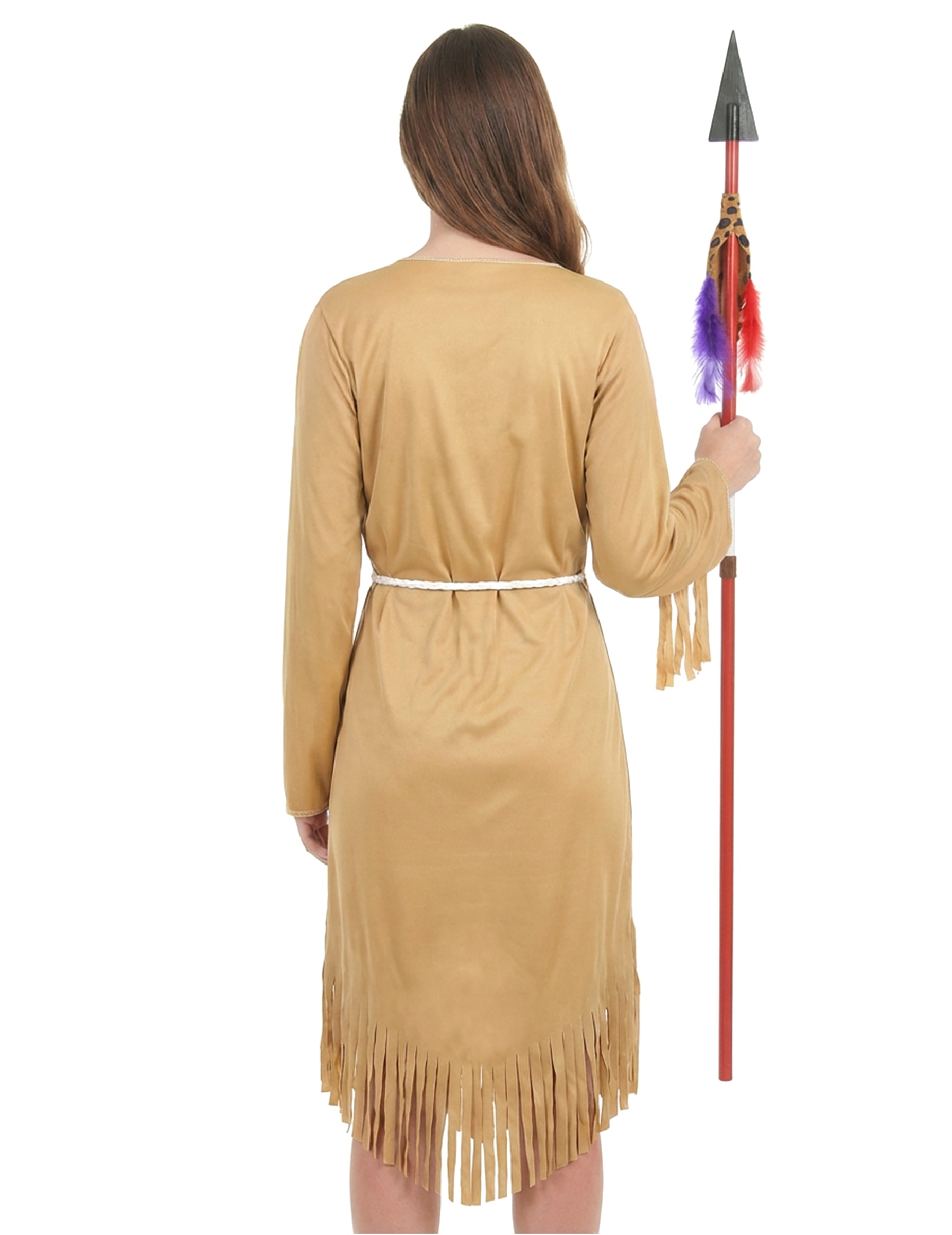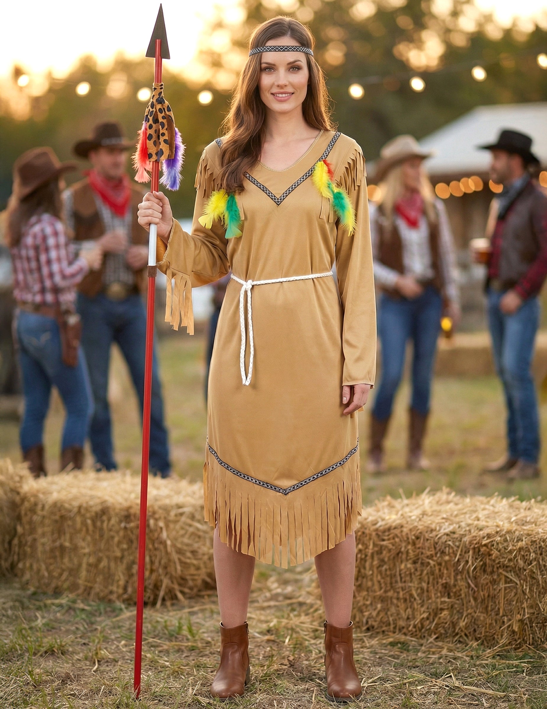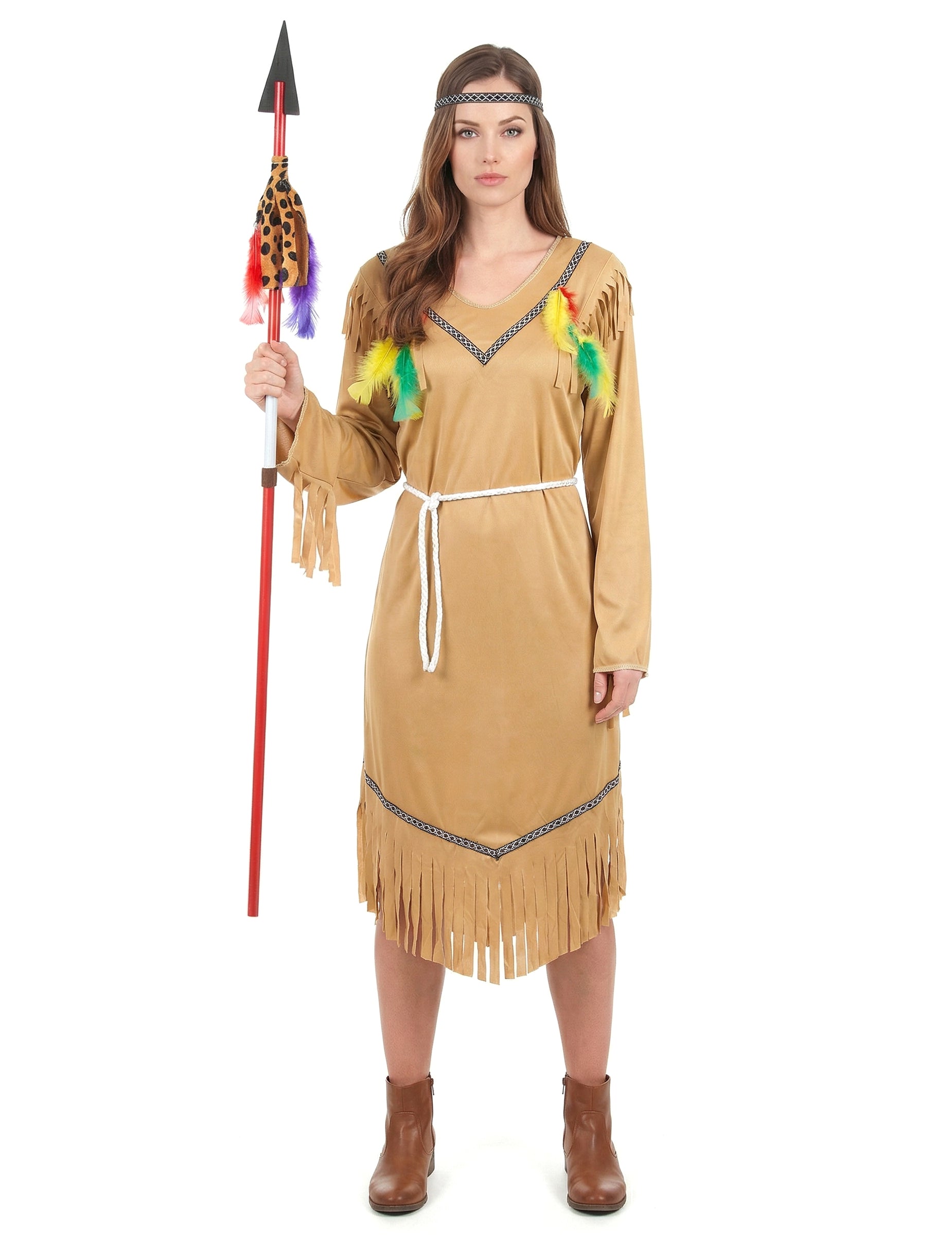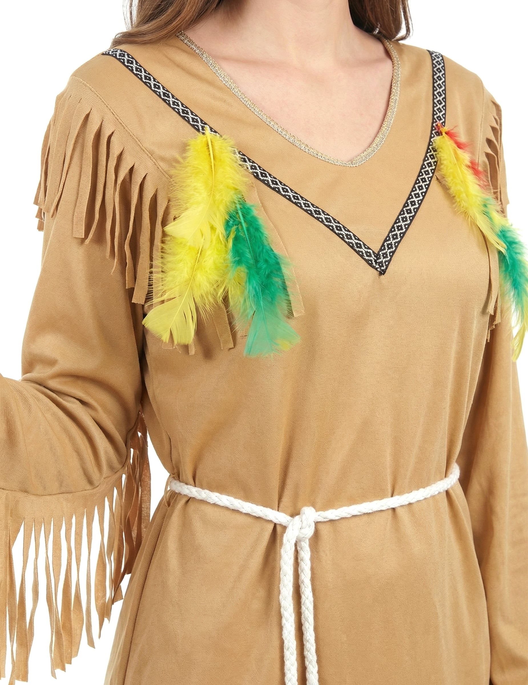 Ez halvány indiai jelmez Ez a női szett egy ruhából, egy övből és egy fejpántból áll (a többi ruha nem tartozék). A hosszú ruha bézs színű... rojtok az ujjakon, a vállakon és az alsó részen. A ruhadarab tetején apró zöld és sárga tollak találhatók.