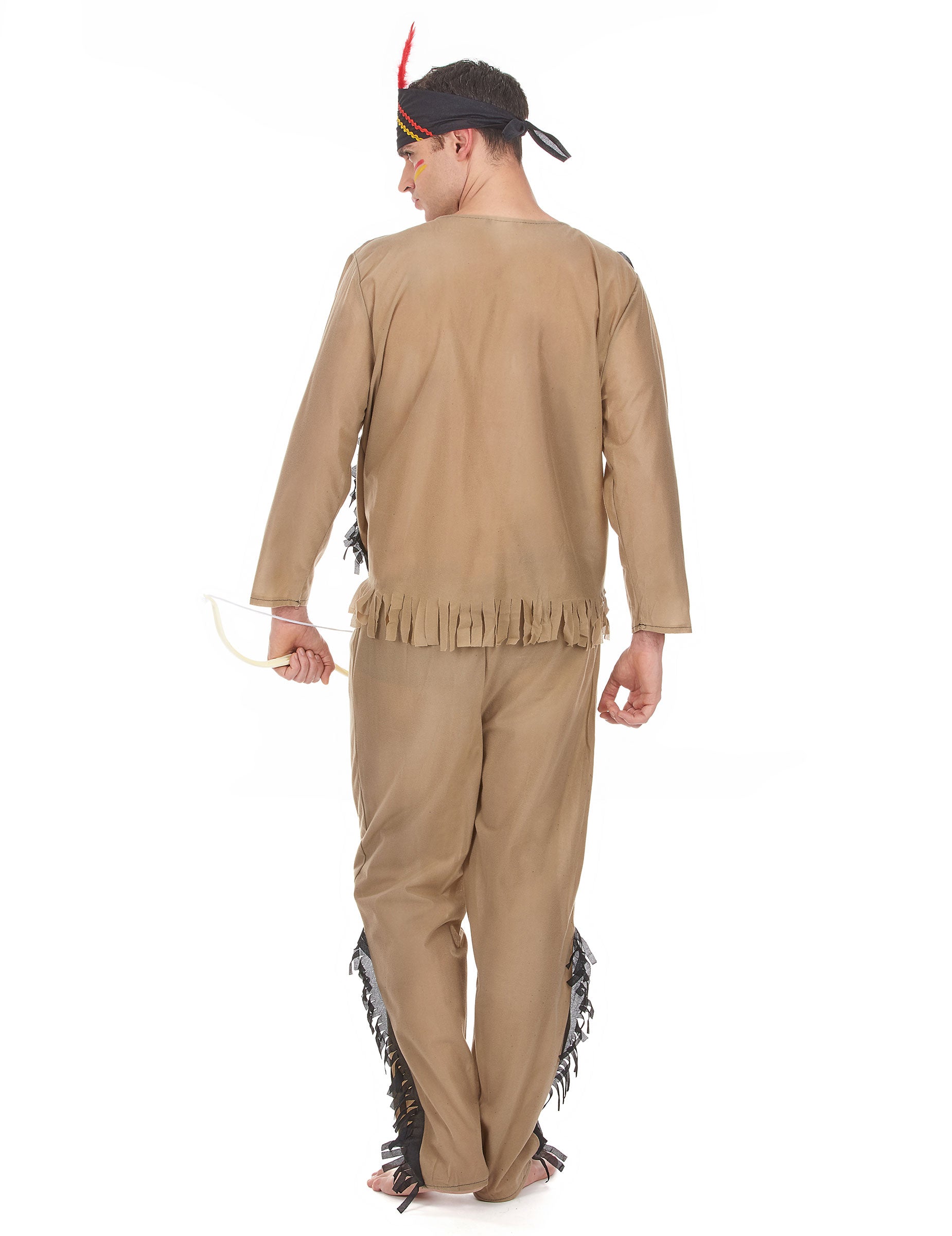 Ez a férfi őslakos amerikai jelmez tartalmaz egy fejdíszt (tollal díszített fejpánt), egy tunikát és egy nadrágot (a fegyver nem tartozék). A tunika bézs színű, bársonyos tapintású. Barna rojtok futnak végig a testen és a mellkason, narancssárga és sárga csíkok díszítik a tunikát. Hosszú ujjú és a nyakkivágásnál húzózsinórral állítható illeszkedést biztosít. A nadrág, gumírozott derékpánttal, szintén bézs színű, bársonyos tapintású. Barna rojtok futnak végig a teljes hosszban, és egy kis kötény is tartozik hozzá illő színekben és mintákban. A barna fejdíszt piros toll és lelógó piros és sárga szegély díszíti. Lépj vissza az időben az őslakos amerikaiak korába ezzel a jelmezzel karneválra vagy bármilyen más jelmezes eseményre.