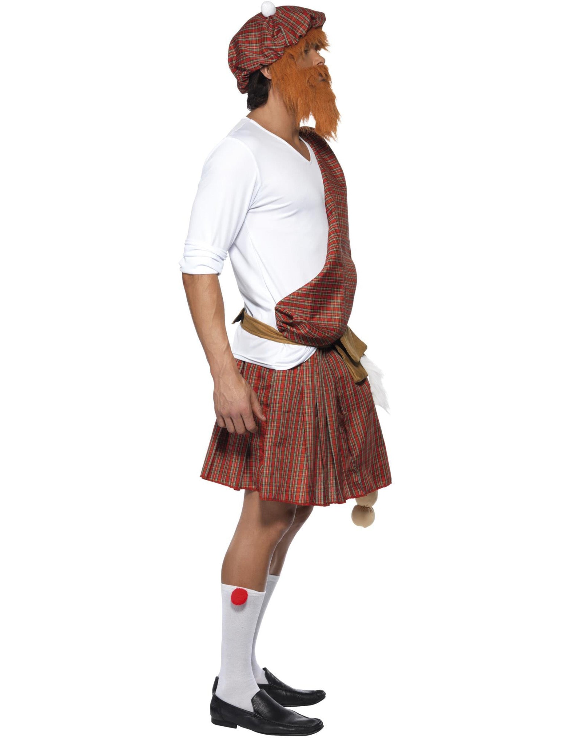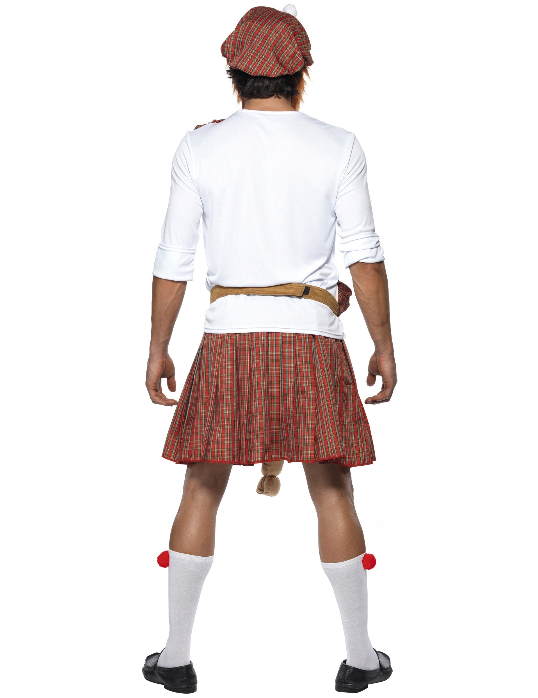 Ez a humoros skót álruhás hat elemből áll. Egy fehér, rövid ujjú póló, amelyen egy pontos kivitelű kipitot kötött, kötve, kezdve a pár és a kalap, amelyen a haj van. A vörös szakáll, amelyet könnyű viselni a kis elasztikus sávoknak köszönhetően. A hamis szexuális öv állítható a karcolásnak köszönhetően. Pár fehér zokni is rendelkezésre áll (cipő nem tartalmazza). Ez a jelmez ideális az álcázott esték animálásához, különösen Szent Patrick során, és minden barátját nevetni.