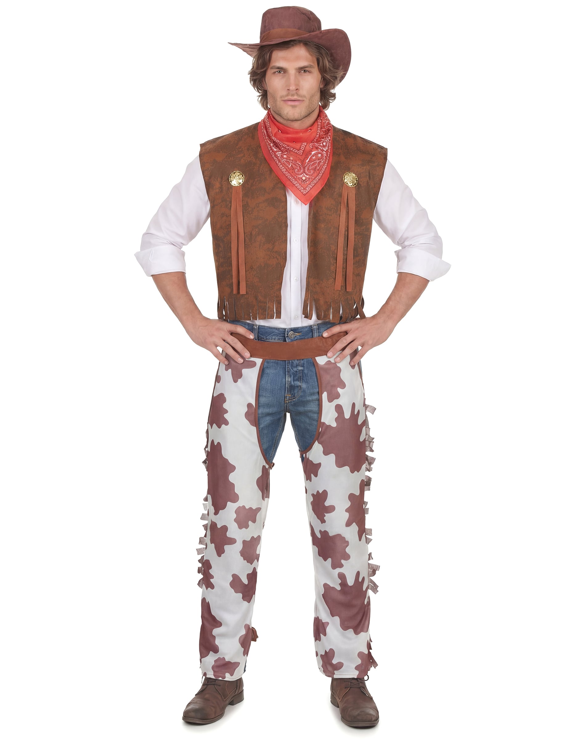 Ez cowboy jelmez Férfiaknak készült, és tartalmaz egy ujjatlan mellényt, egy sálat, egy sapkát és egy chaps-et.