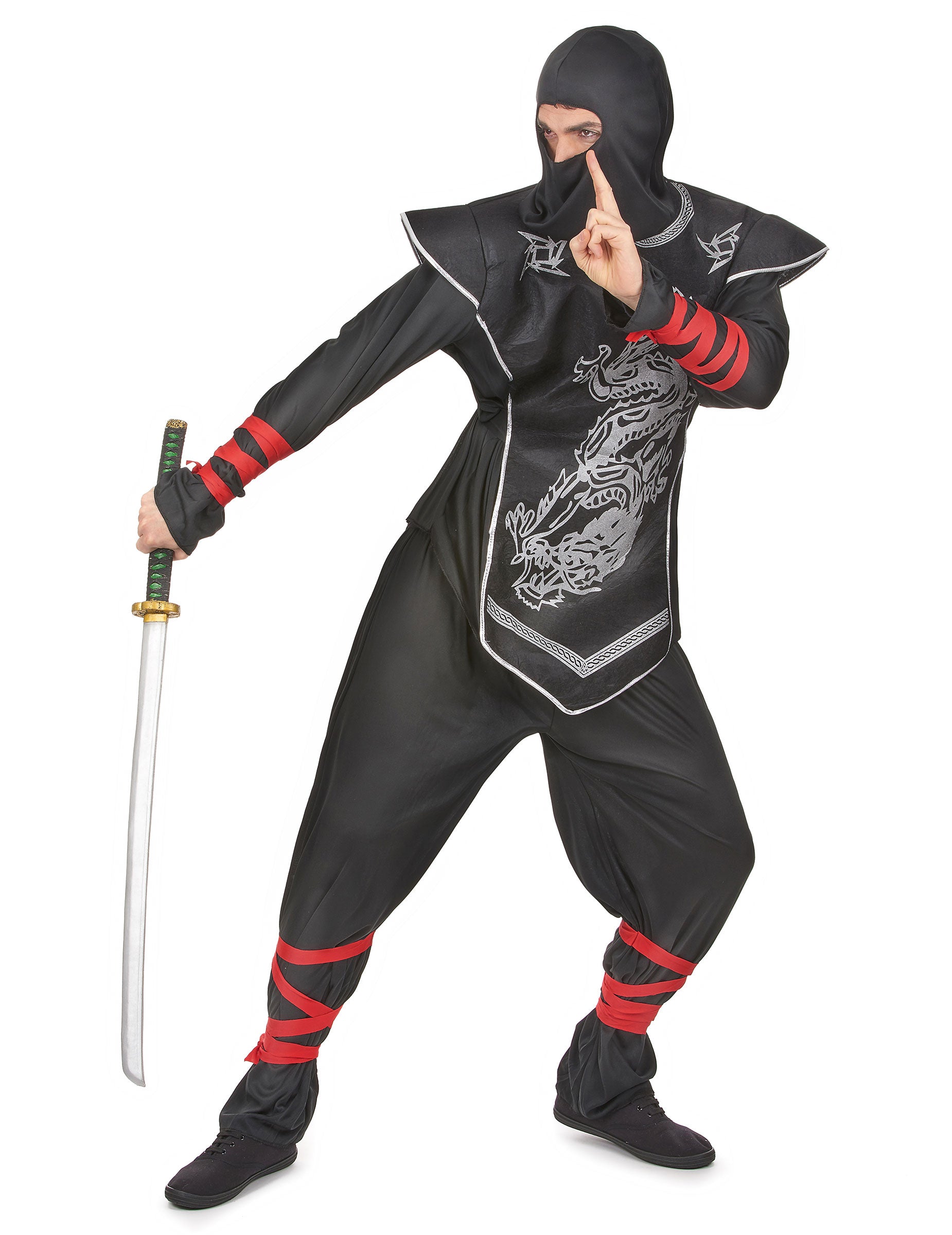 Ez a nindzsa jelmez a férfiak számára felső, plastron, nadrág és motorháztetőből áll (a Sabre nem tartozik). A teteje fekete és hosszú. Az előlegeit összefonódott piros szalagokkal körözheti. A plastron a tetején varrva van. Vastag filcből készül, és a vállával nem fog elmulasztani, hogy sok tempót ad neked. Csak két linket kell felépítenie a hátán, hogy alkalmazkodjon a morfológiához. Egy szürke sárkány és Shuriken elölre kerül. A nadrág széles és tiszta elasztikus méretű, biztosítja a kényelmét. A borjakban összefonódhat a piros szalagok, hogy meghajoljon a nadrág alját. Végül a motorháztető megkarcolja a nyakát, és hagyja felfedezni a szemét. Ez egy nagyon teljes jelmez, hogy az inkognitót átadja barátaitól a karnevál vagy bármely más álcázott esemény során!
