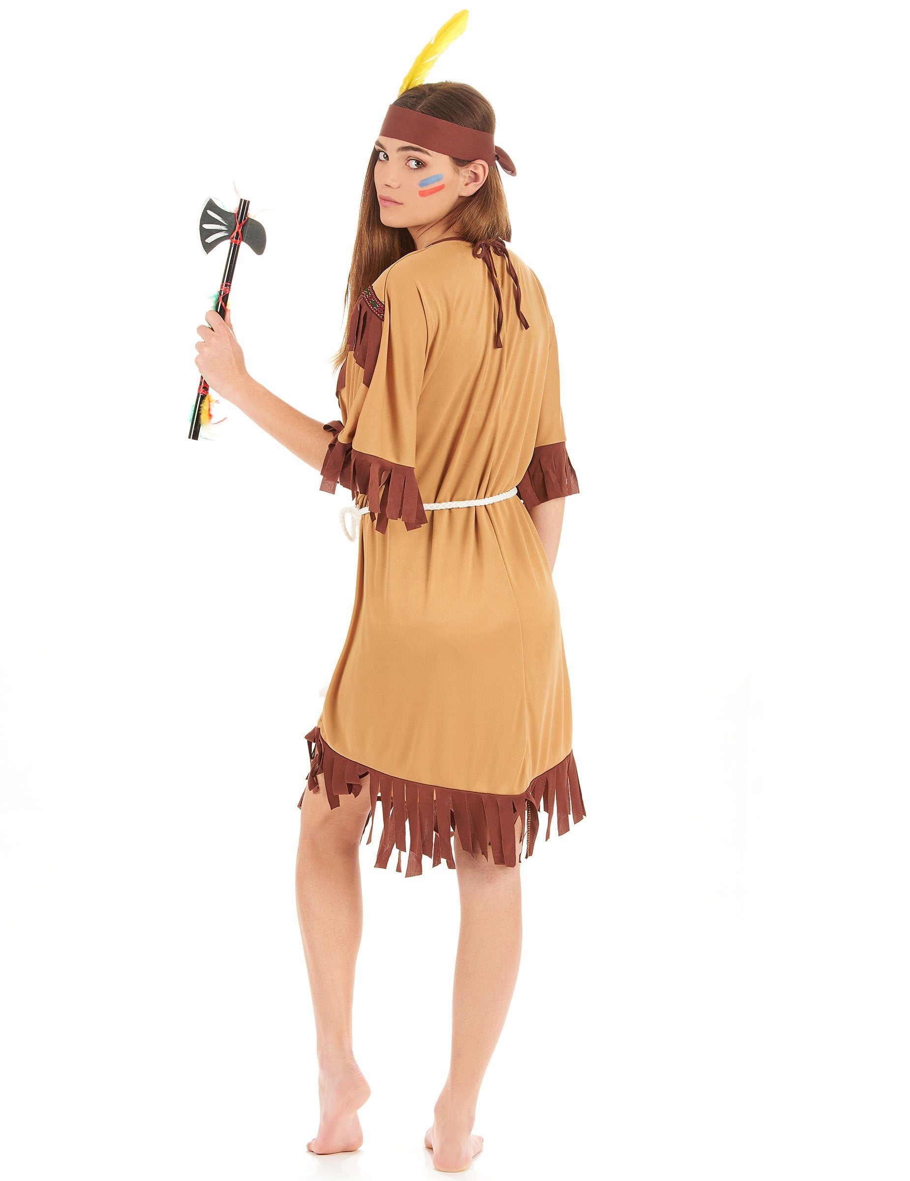 Ez az indiai nőknek szóló jelmez ruhából, övből és fejpántból áll. A ruha tiszta barna. A ruha tetejét egy indiai mintázat díszíti, hamis ékszerekkel és barna rojtokkal, amelyeket etnikai határ határol. Az öv fehér kötélből készül. Ez aláhúzza a méretét kegyelemmel. A barna fejpánt a feje körül van kötve. A fejpánthoz sárga toll van. Ez az indiai jelmez tökéletes lesz az indiánok vagy a Nyugat -Nyugat témájának álcázott estére.