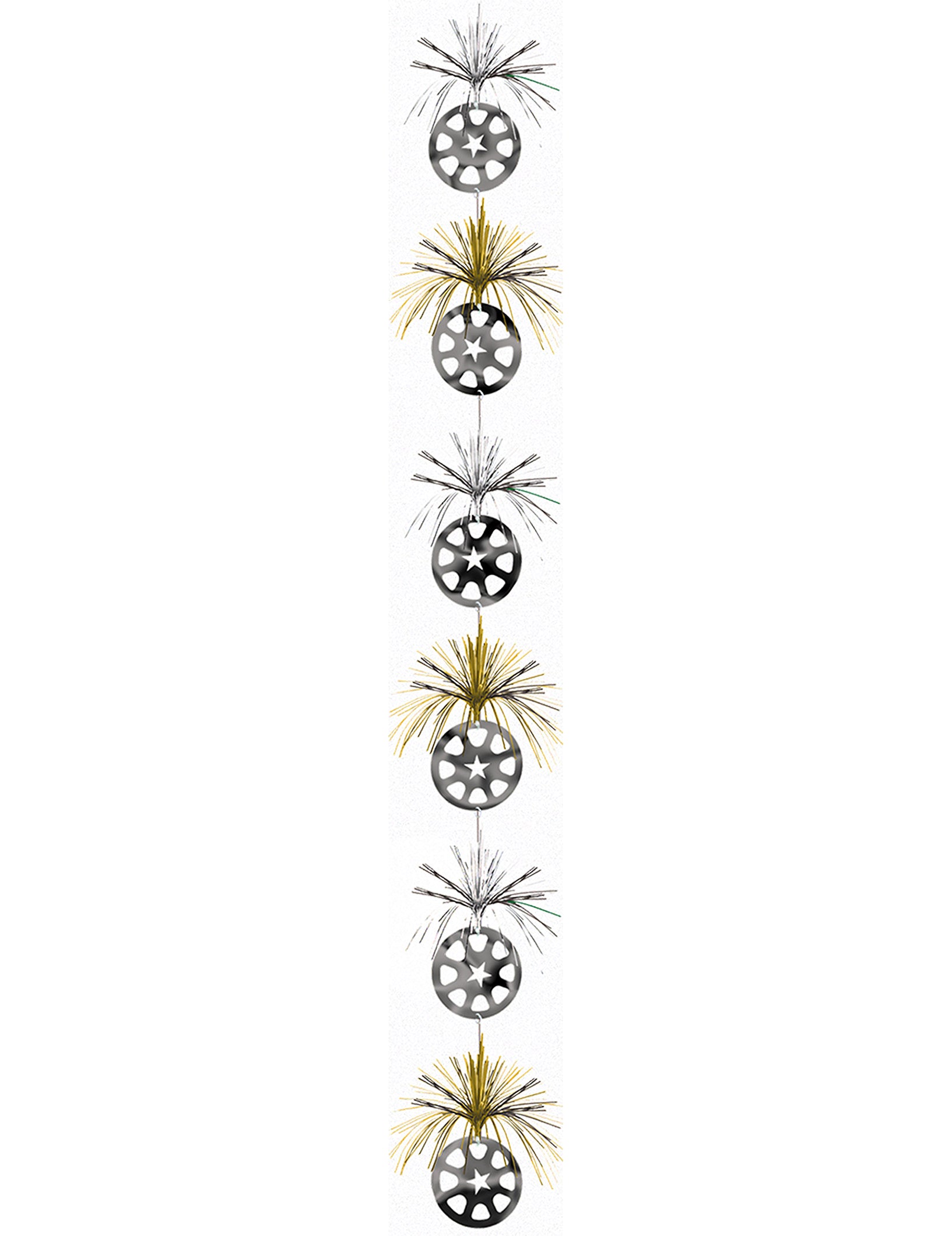 Ez a függő dekoráció arany és ezüst színű. Körülbelül 2 méteres mérést mutat, és az arany és az ezüst fém vízesések által átfedezett mozitekercset képviseli. Ez a kiegészítő ideális lesz a parti légkör díszítéséhez és létrehozásához esténként a mozi vagy más ünnepi rendezvény témájáról.