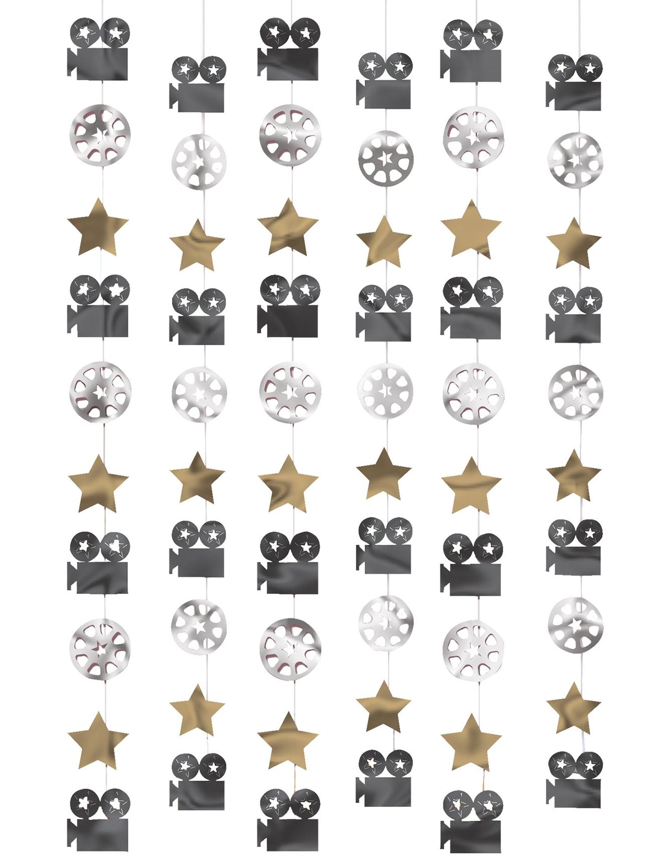 Függöny "Hollywood Party", amely 6 dekoratív koszorúból áll, hogy megfelelő mintákkal lógjon a mozi témáján (kamera, film orsó, csillag), mindegyik huzalra van felszerelve. Magasság: 2 méter. Ideális, hogy felfüggesztsék az ajtó vagy egy nagy ablak előtt.