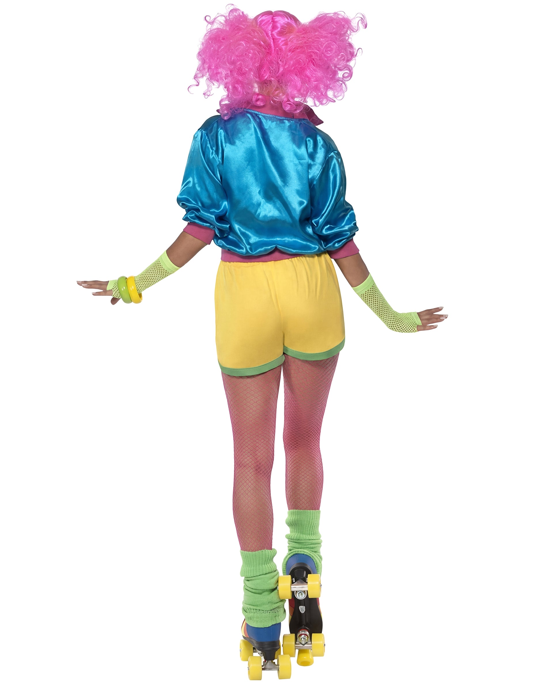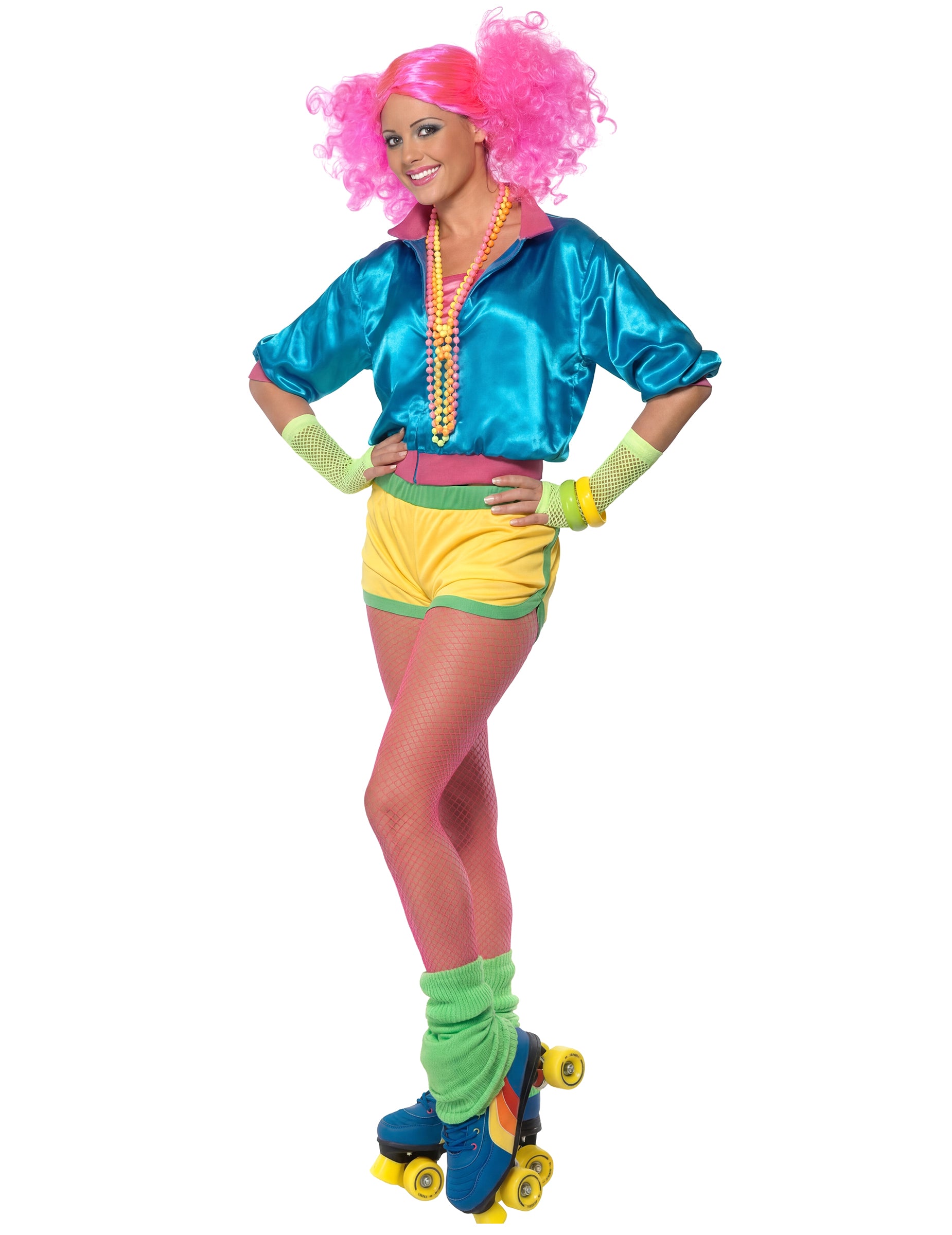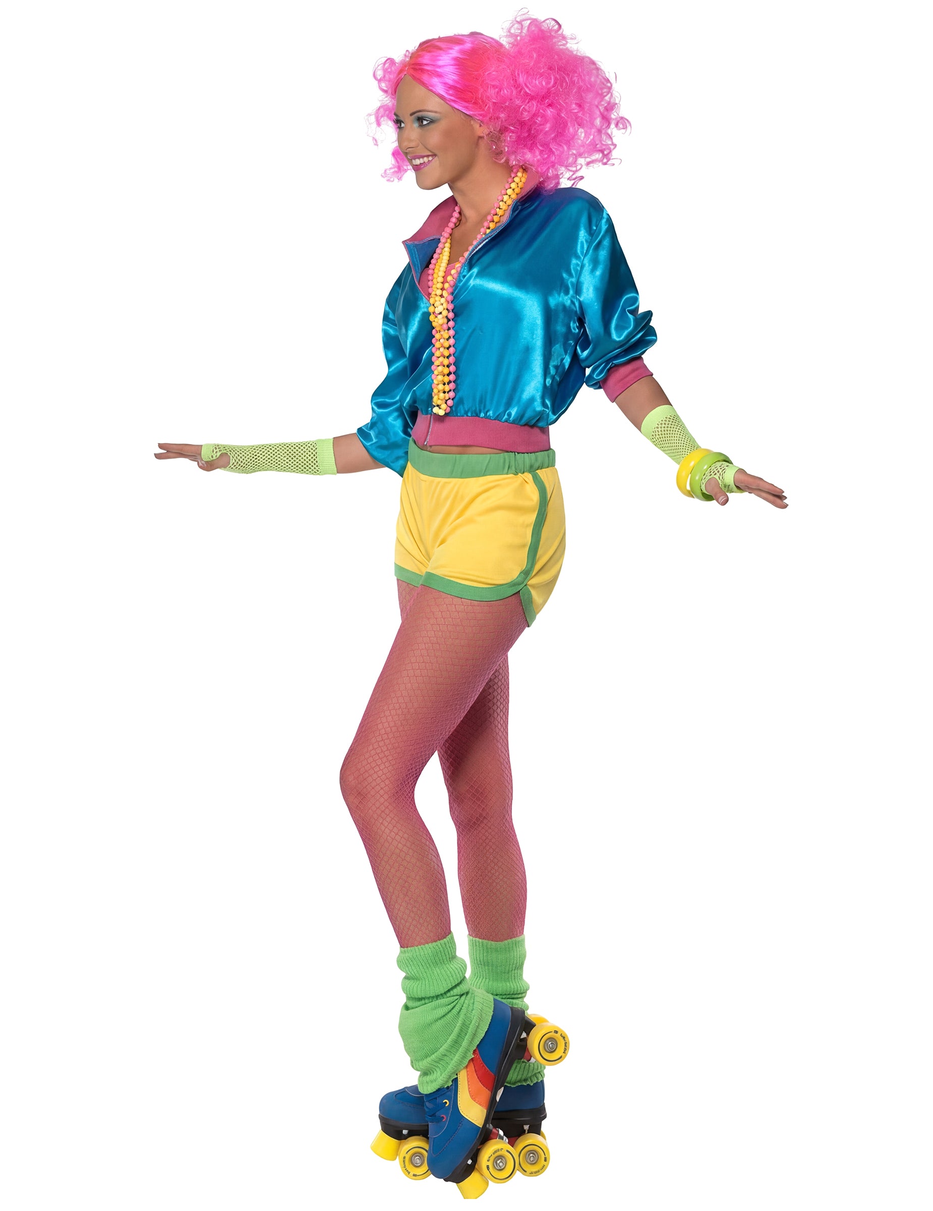 Ez a női görkorcsolyás jelmez egy fűzőből, egy dzsekiből és egy minishortból áll (paróka, zokni, csuklószorító, ékszerek, görkorcsolya nem tartozék). A fűző rózsaszínű, a mellkast fedi, és két gumipántjának köszönhetően könnyen igazodik a testhez. A minishort sárga, zöld csíkokkal a szélén, combnál enyhén nyitott, hogy az 1980-as évek sportnadrágjaira emlékeztessen. Végül egy kék, „szatén” hatású melegítőfelső teszi teljessé a jelmezt. Cipzárral záródik, és enyhén szűkített az ujjaknál és a deréknál. Ez a jelmez tökéletes választás sportos jelmezes napokra vagy bármilyen más ünnepi alkalomra.