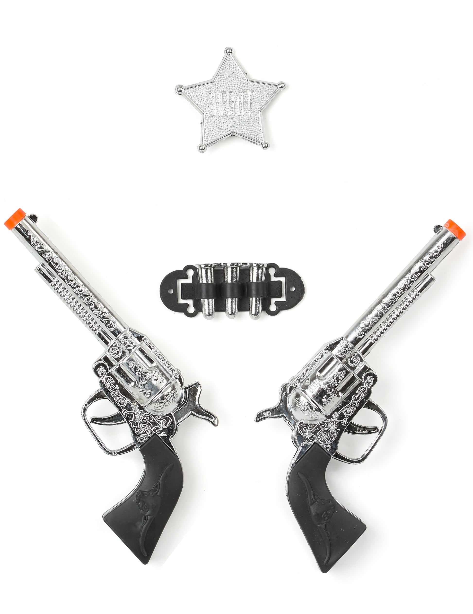 Ez a cowboy -készlet két 17 cm -es pisztolyt, valamint egy ezüst műanyag csillagot tartalmaz a "seriff" említéssel. A készlet golyókat is tartalmaz. A rend és az igazságosság lesz a kulcsszavak. Ideális egy álruhát egy karnevál vagy egy téma alatt. Ez a készlet nem alkalmas 3 év alatti gyermekek számára.