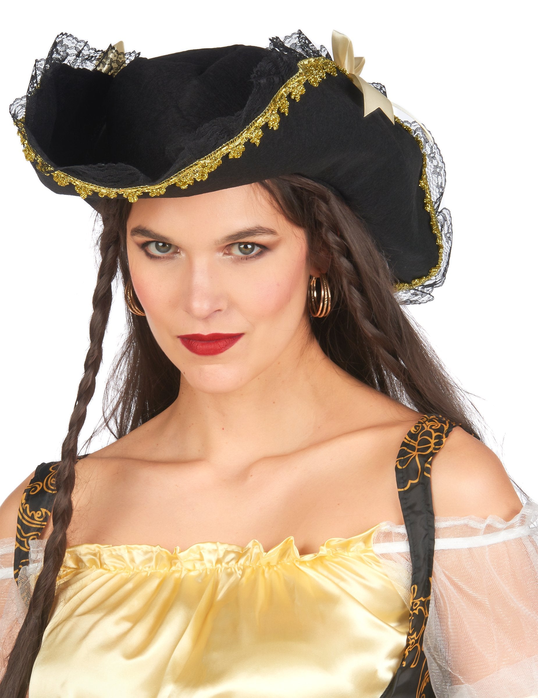 Ez a nők számára a kalóz álruhája rövid ruhából, kalapból, alsónadrágból és fűzőből áll (Sabre és cipő nem tartozik). A szatén sárga ruha vitorlás ujjaival rendelkezik. A finom fekete fűzőt a harisnyatartókkal a ruhára helyezik. A melltartó sárga, az aranyminták pedig az elülső oldalra nyomtatnak. A finom alsónadrág és a fekete kalap (kb. 58 cm -es fejtorony) szintén kiegészíti ezt a jelmezet. Ez a nagyon szexi álruhás ideális lesz a legkevésbé ellenállhatatlan kalózok számára a téma estéi alatt.