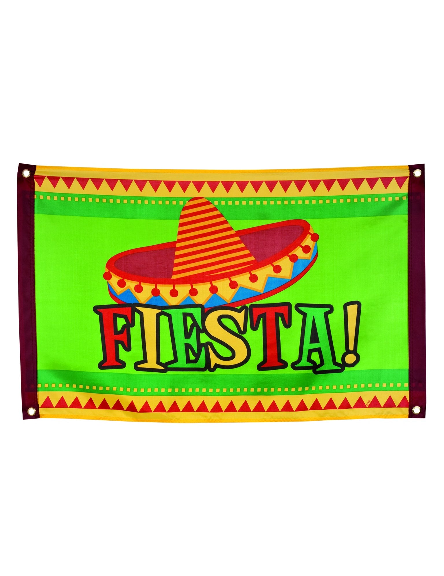 Ez a mexikói színben lévő zászló 90 és 60 cm. Könnyedén rögzítheti kis gyűrűkkel a zászló 4 sarkában. Ez az elem hozza a "Fiesta!" Feliratot. És ideális lesz a szoba melegítéséhez és díszítéséhez egy álruhás vagy témájú esemény során.