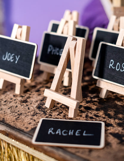 Ez a kicsi faállvány 6 cm széles és 10 cm magas. A pala köszönhetően ez a támogatás lehetővé teszi, hogy megírja a kis szavait vagy a vendégek nevét, hogy az asztalához helyezze őket.