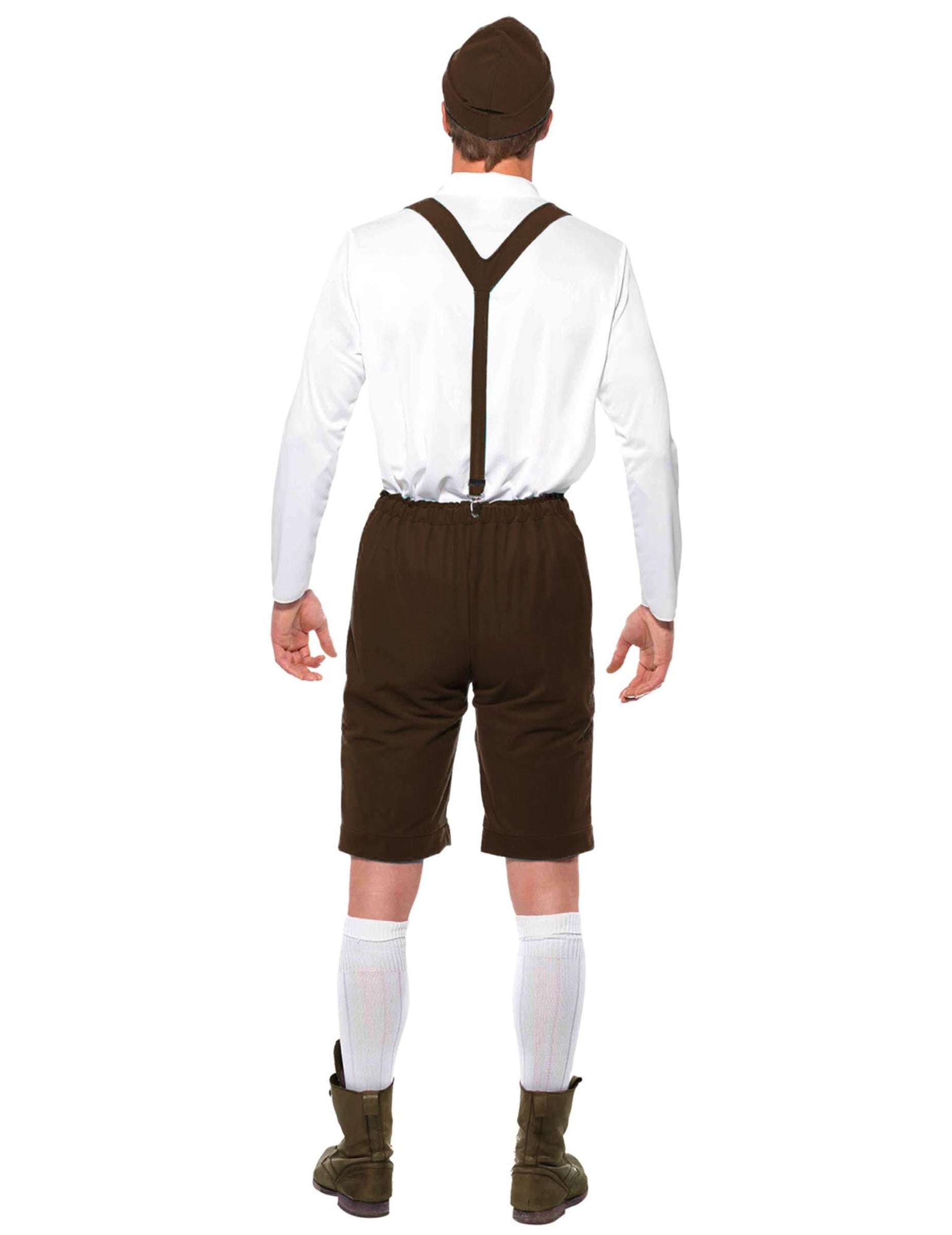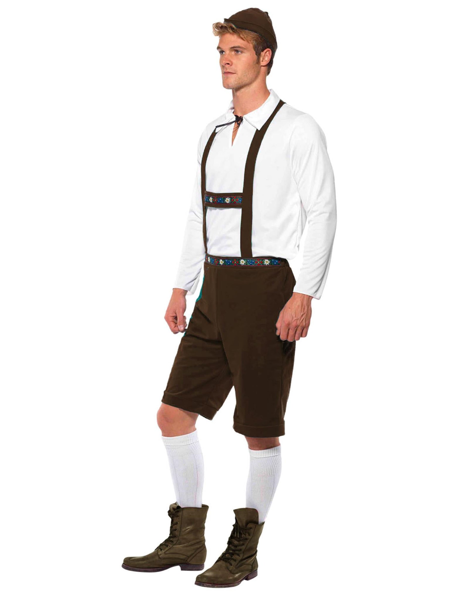 Ez a férfiak számára ez a bajor álruhát egy magas, egy overális és egy kalapból áll (zokni és cipő nem tartalmaz). A hosszú, fehér, leplezett tetejének elöl egy nyitott gallérja van, amely finom fekete lánccal zárul le. A barna kezeslábas rövid, puha bőrhatás szövetben. A hevedereket és a méretet egy nagyon színes virágos szegély hangsúlyozza. A nagyobb kényelem érdekében a méret elasztikus a hátsó részén, és a harisnyatartók a klip mellett zárják be a hátulját. Végül, egy barna kalap, amely megfelel a kezesnek, az utolsó érintést hozza ennek a jelmeznek. Ez az álruhás tökéletes lesz egy igazi bajor megtestesítésére a sörfesztivál alkalmával.