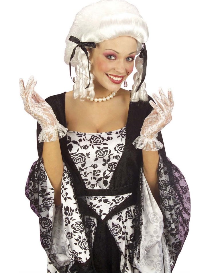 Ezek a rövid felnőttkori kesztyűk fehér csipkében vannak. Körülbelül 25 cm hosszúak a maximumig. Ezek a fehér csipke kesztyűek tökéletesek lesznek egy barokk vagy reneszánsz esti Marquise jelmez kitöltéséhez. Copyright Widmann SRL