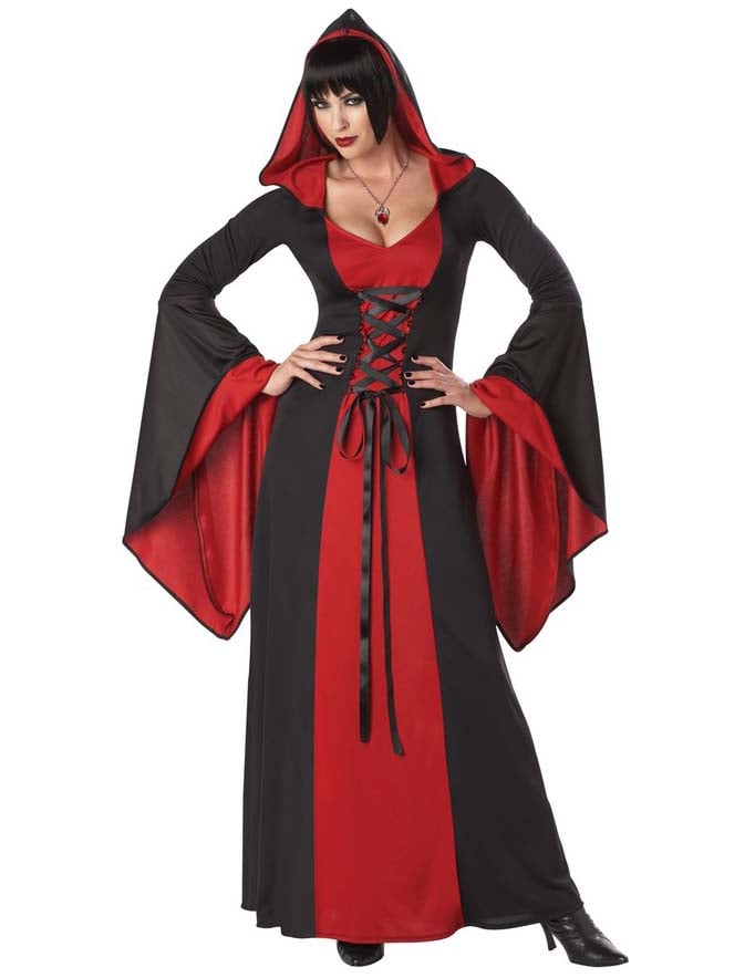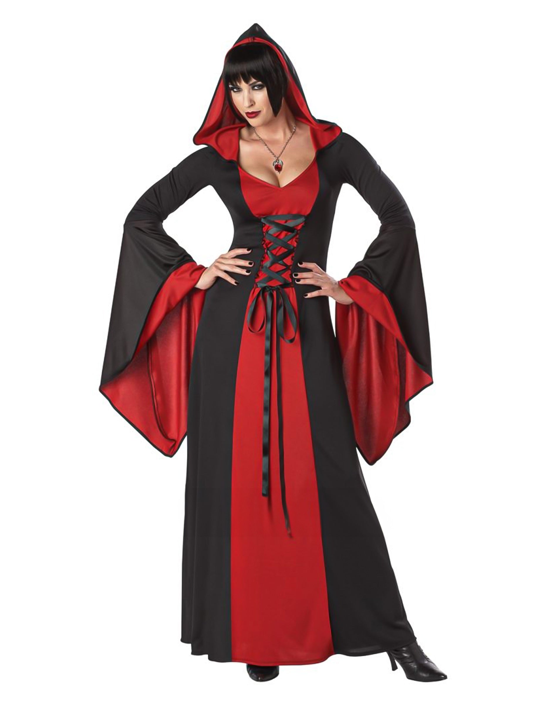 Ez a nők számára ez a gonosz álruhás kapucnis. A fekete és a piros ruha tökéletesen alkalmazkodik a morfológiájához, köszönhetően annak elülső részén. A motorháztető és a nagy fellángolt ujjak piros színűek. Ez a jelmez tökéletes lesz egy gonosz boszorkány megtestesítésére egy középkori fesztiválon vagy egy vámpíron a Halloween számára.