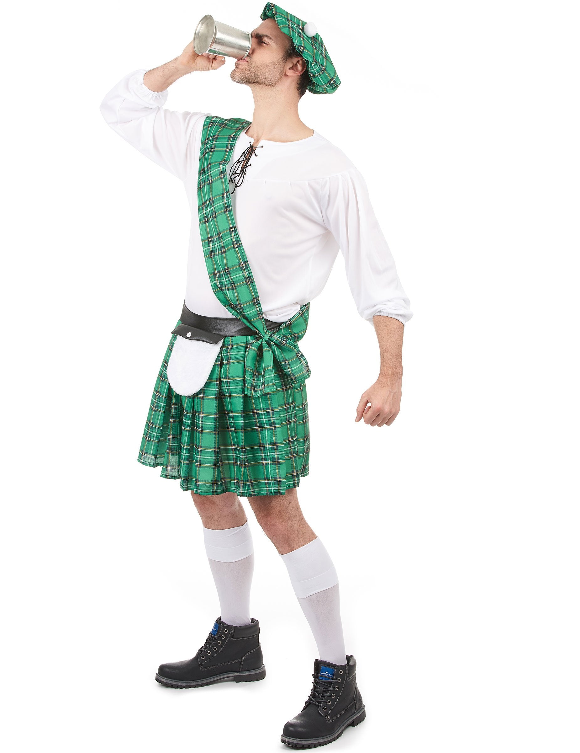 Ez a felnőtt jelmez a skót jelmezt képviseli. Ide tartozik egy ing, egy kipt, egy kalap és egy szalag (zokni és cipő nem tartalmaz). A fehér ing hosszú -leseeved. A poliészterben az ujjainak vége elasztikus sávokkal rendelkezik, hogy az ujjak kissé puffadjanak. Egy fekete csipke bezárja a nyakát. A hagyományos tartán motívumon a Kilt -ben viselik. Ezt a szoknyát fekete övvel és egy kis táskával díszítik. A sál valóban a tartánot a törzsön keresztül kötik. A fejbe illesztő svájcisapkát a fejbe dőlik. Egy fehér pompom díszíti ezt a tam o'shantert, amely jellemző a hagyományos szociális jelmezekre. Egy álruhás este alatt valódi skótvá váljon.
