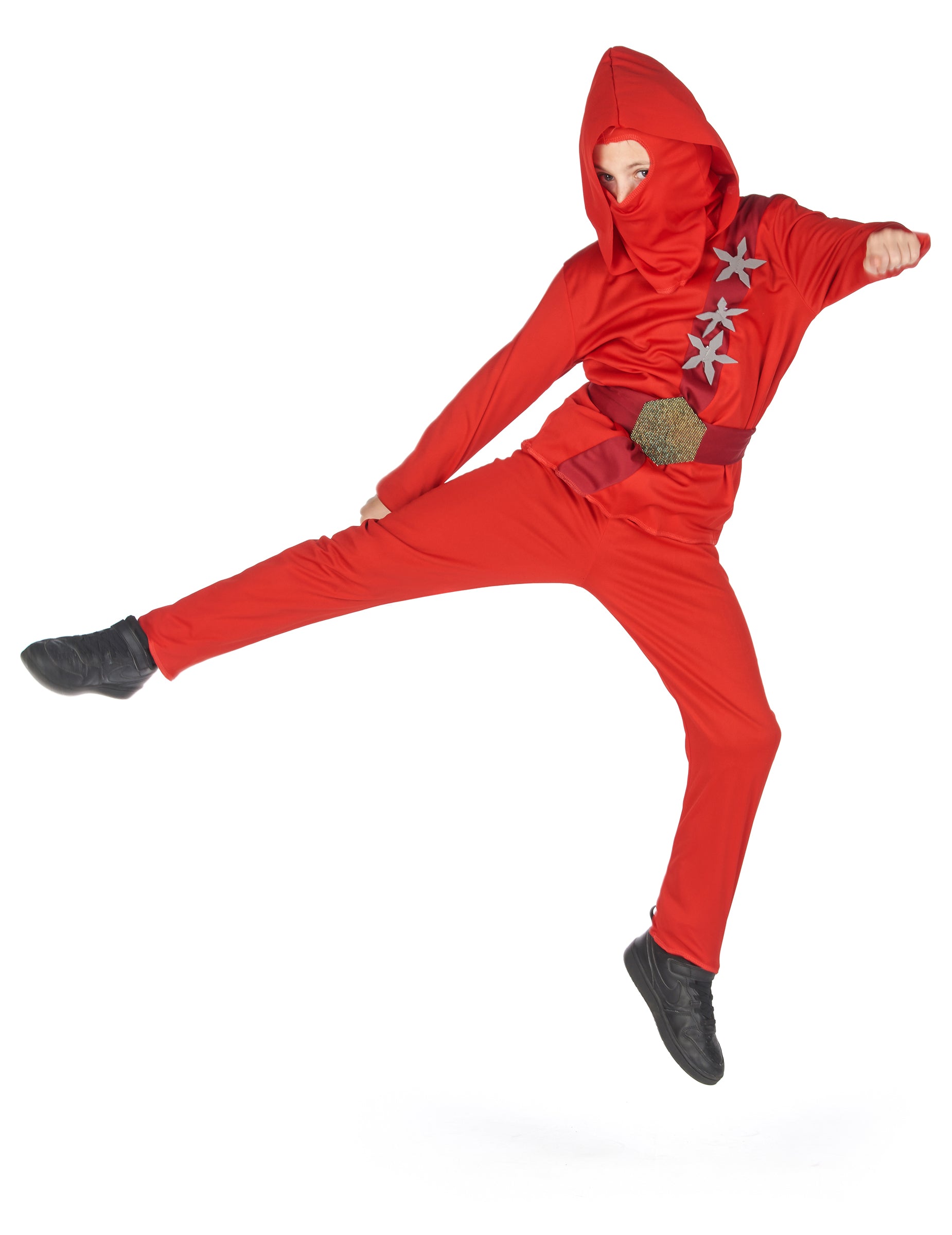 Ez a gyermek jelmez egy japán kém ruhának utánozása. Ez magában foglalja a kapucnis pólót, a nadrágot, az övet és a motorháztetőt (nem tartalmazza a cipőt). A tunika hosszú ujjú. A motorháztetőt varrják a vállakra. Három poliészter shuriken csillagot rögzítenek a mellkason átmenő szövetcsíkon. Az öv a póló és a piros nadrág fölé helyezhető. A hatszögletű poliészter alkatrész hurokként működik. A piros motorháztető befejezi ezt a jelmezt, hogy elrejtse a fiatal szamuráj személyazonosságát. A karnevál számára álcázza a fiát a harcművészet ninja szakemberében.
