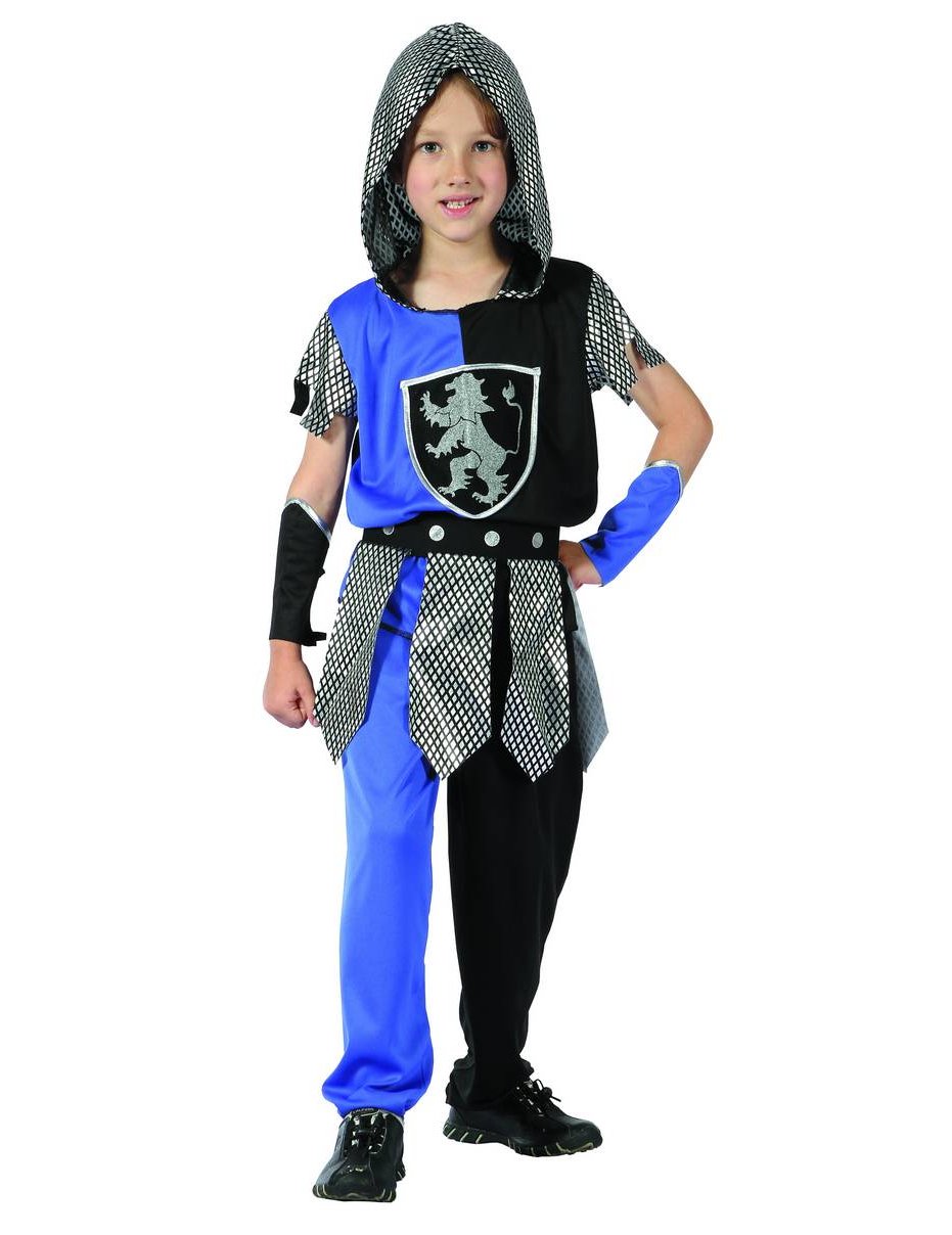 Ez a gyermekkori jelmez középkori lovagot idéz elő. Ez magában foglalja a kapucnis tunikát, a nadrágot, az övét és az ujját (nem tartalmazza a cipőt). A tunika két color. A mellkasra egy jelvényt varrnak. Ez a katona hűségét képviseli az ezüst oroszlán szimbólumával. A rövid hüvelyeket rés alakjában vágják, és a szövet egy hálórétegre emlékeztet. A motorháztető hálóban valósul meg a fejdíszet. Egy fekete öv ezüst ragyogással és 25 cm -es csíkokkal segíti a tetejét. Scratchrel bezárul. A nadrág szintén kék és fekete. A méret rugalmas. A hüvelyek mindegyike olyan színű, hogy az egész szimmetrikus legyen. Rögzítik a karcolások segítségét. Snacket szervez a középkor témájáról, vagy a fia részt vesz a karneválon, lovagba öltözi.