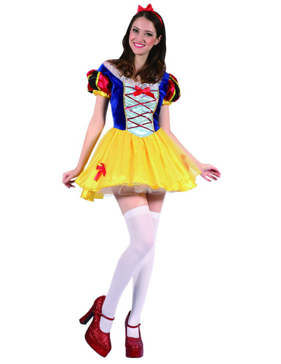 Ez a tündér tündér hercegnő, a nők számára elrejtett álruhás egy ruhát és egy fejpántot (az alma és a cipő nem tartalmaz). A kék, a sárga és a piros ruha poliészterből készül. Széles csipke nyakkivágással és kis puffadt ujjakkal a tetejét a vörös csipkék hangsúlyozzák. A több fodros alsónadrág sárga. A fejpántot egy kis piros poliészter csomóval díszítik. A jelmez estének vagy a rajzfilmek témájának ideje egy jól ismert hősnőt testesít meg.