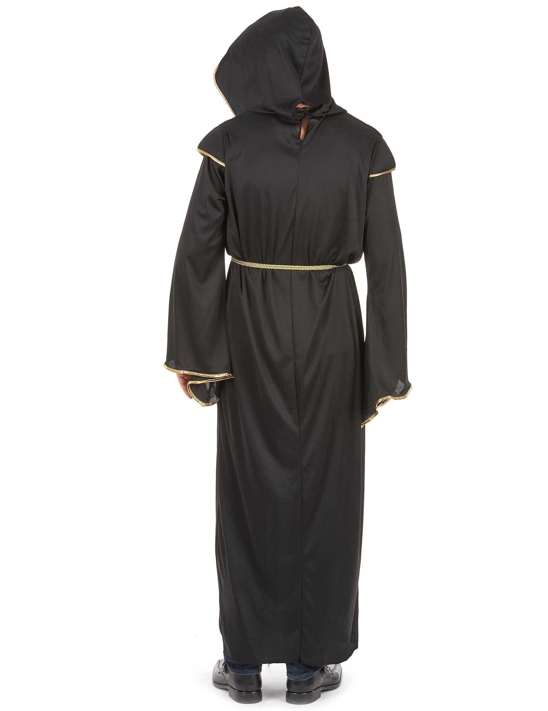 Ez a felnőtt jelmez a szerzetes ábrázolása. Tartalmaz egy ruhát és egy övet (nadrág, könyv és cipő nem tartalmaz). A hosszú ruha finom fekete poliészterben van. Fekete motorháztetőt varrnak, és egy csipke lehetővé teszi, hogy bezárja a gallérot a nyakon. A varrás befejezése arany. A mellkasra egy aranykereszt nyomtat. Az arany öv egy egyszerű kötelet képvisel. Eredeti akar lenni egy jelmez vagy témájú este alatt, ez az aszkéta álrizó megfelel neked.