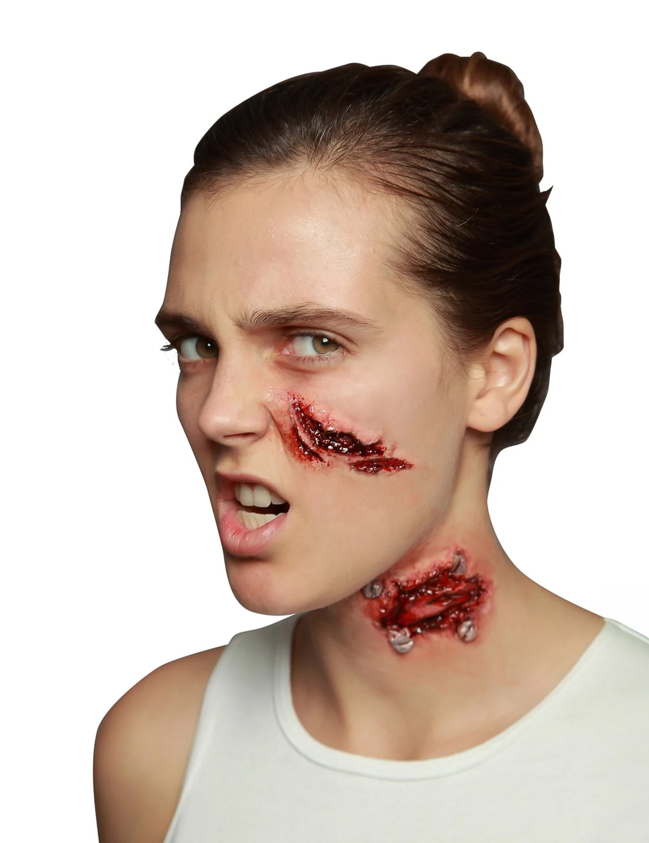 Ez a hamis mély vágás latexben van (hamis nyaki sérülés és ragasztó nem tartozik bele), tökéletesen húst képvisel, és még inkább valósághű, ha hamis vért ad hozzá. A Halloween számára viselje ezt a hamis sebet, és rettegjen szeretteit egy szörnyű este alatt!