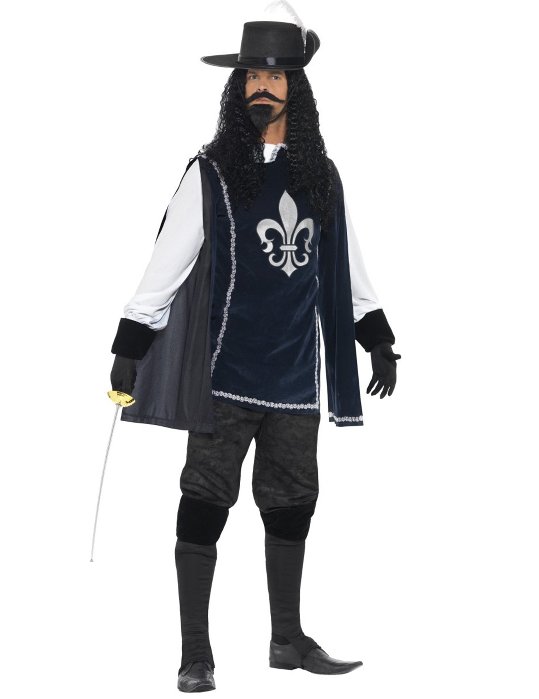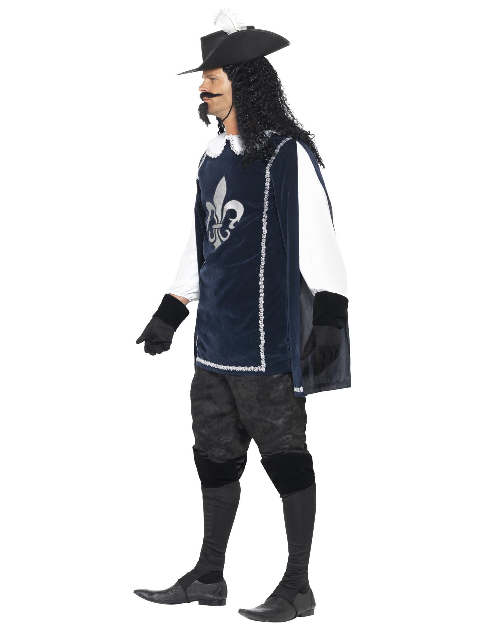 Ez a szokások muskétás jelmeze egy felső, kalap, egy kesztyű, egy pár sur-boots, egy bajusz és egy barbichette (nadrág, kard és cipő nem tartozik). A velúr tényleges kék nagy hatással hosszú ujjú. Ezek rugalmasak a csuklóval a nagyobb kényelem érdekében. Egy ezüst fleur -de -lis elülső oldalra kerül. Egy csipke által határolt, kicsi, fehérgallér elegánsan befejezi ezt a muskétás tetejét. Ez a teteje linkek segítségével bezárja a hát tetejét. A filc kalapot az egyik oldalra hajtogatják. Fehér toll díszíti, és könnyen megőrzi a fejét 2 linkkel, hogy az álla alatt kötözhessen. A kesztyűt, valamint a SUR-boots-t elasztikus fekete szövetben készítik, amely nagy merevebb szegéllyel, velúrhatással rendelkezik. A körvonalak szintén lefedik a cipő tetejét, és rugalmassággal tartják a lábak alatt. Végül, egy önálló fekete bajusz és Barbichet hozza az utolsó érintést ehhez a muskétás jelmezhez. Ez a kiváló jelmez tökéletes lesz a 3 muskétás kalandjainak megélésére egy párt alkalmával a reneszánsz témájáról.
