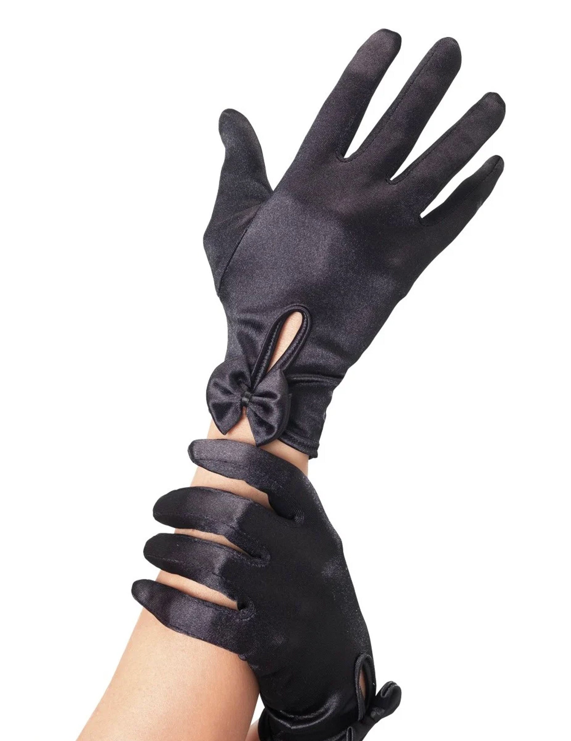 Ezek a felnőtt kesztyűk fekete anyagból készülnek. Röviddel a kéz tetején van egy kis nyílásuk, egy kis csomóval. Ezek a kesztyűk tökéletesek lesznek Charleston vagy az 1940 -es évek álruhájának kitöltésére elegáns és elbűvölővel.