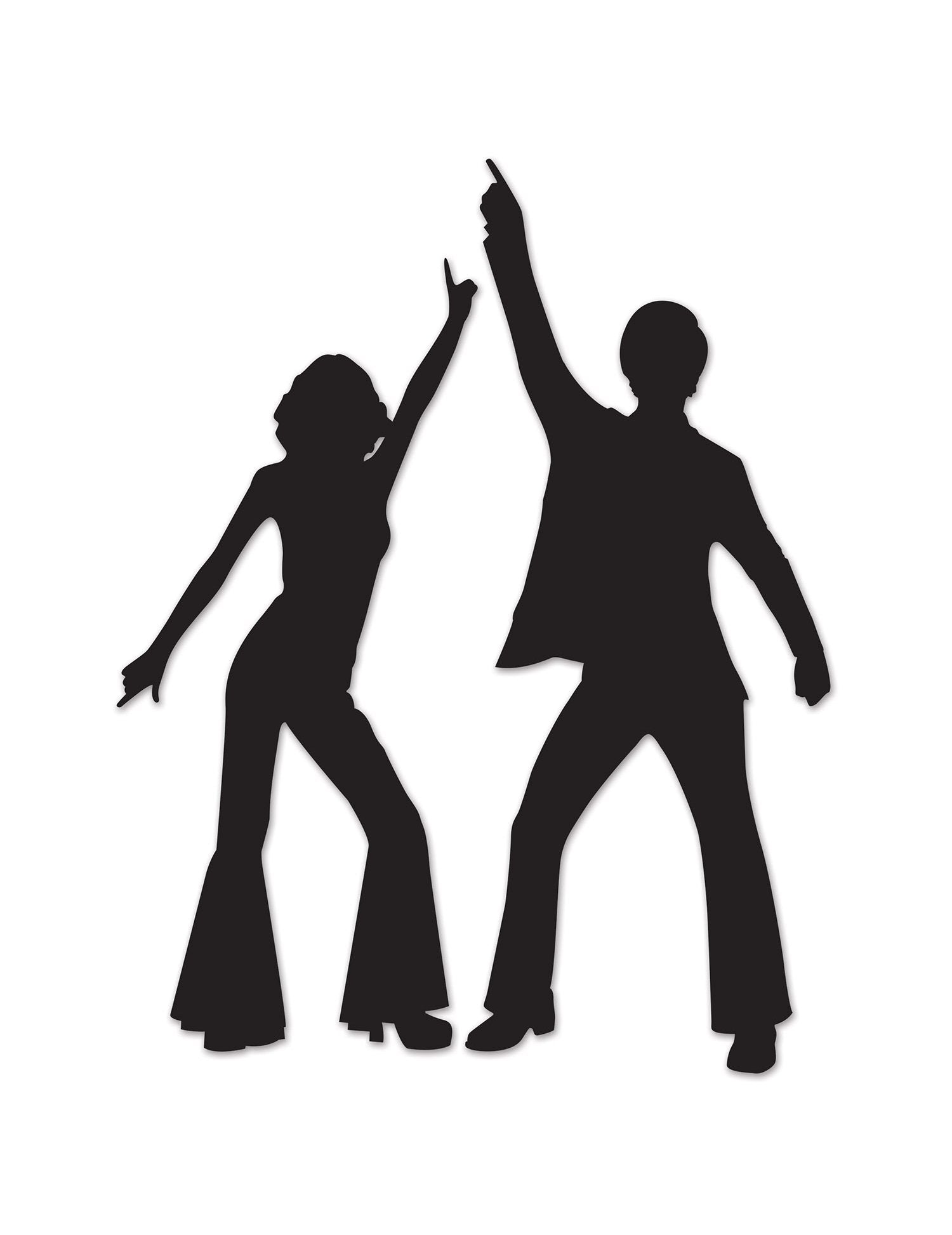 A diszkó táncosok 2 fekete dekorációja egy nő sziluettjét és egy férfi sziluettjét képviseli. A női dekoráció körülbelül 83 cm magas, a férfiak dekorációja pedig körülbelül 93 cm. Kiválóan alkalmasak a falak díszítésére egy retro estére.