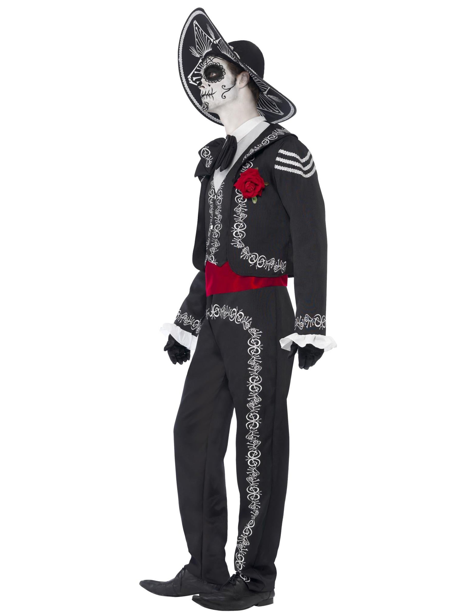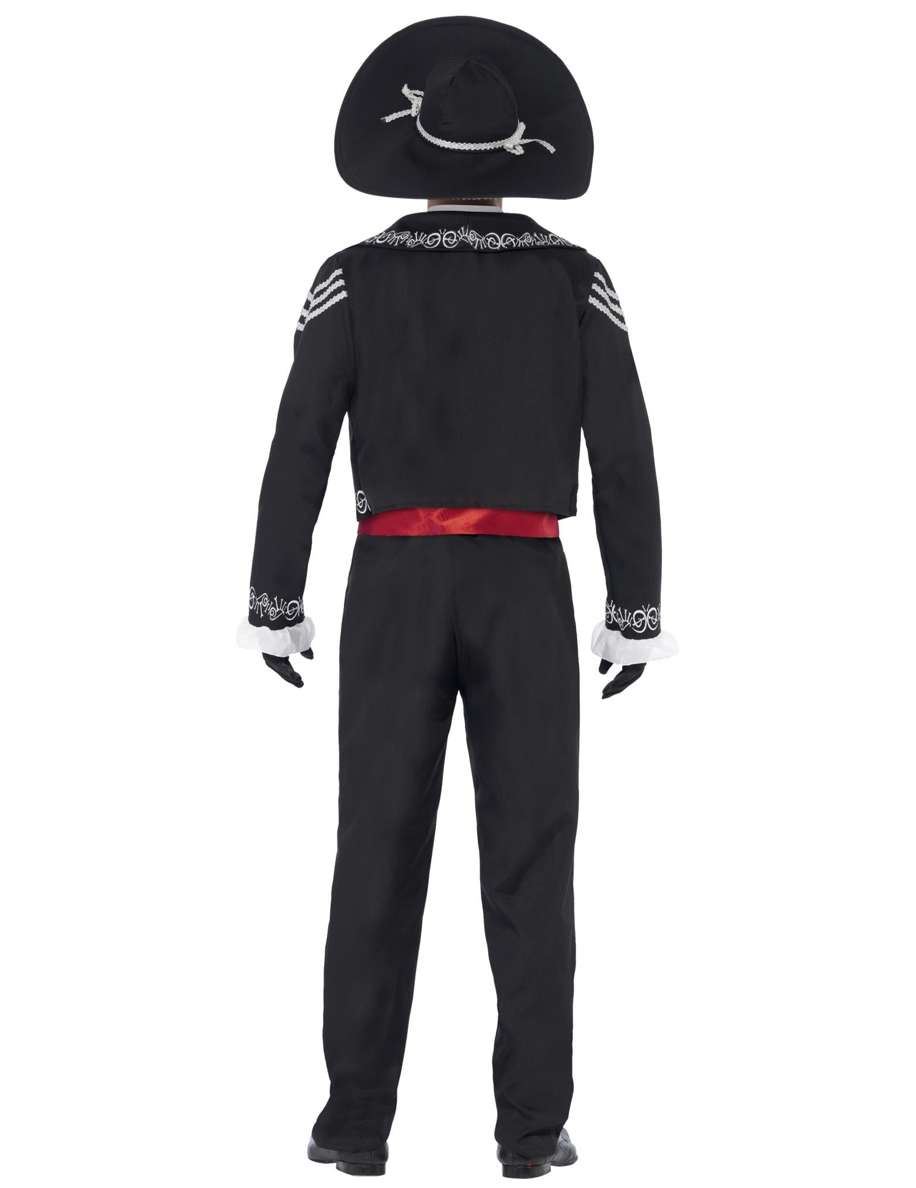 Ez a mexikói csontváz jelmez kabátból, nadrágból, hamis ingből és kalapból áll. A fekete nadrágnak a derék körül van egy elasztikus sáv, amely lehetővé teszi, hogy alkalmazkodjon a morfológiához. A csont alakú fehér arazkik az egész nadrágba pörgnek. Megtalálja ezeket a mintákat a kabáton, a kalapon és az ingben. A hamis ing könnyen fel van helyezve, és karcol a hátába. Fehér gallérjának nagy fekete pillangócsomója van. Az ing egy csillogó vörös szöveti övvel ér véget. Egy gyönyörű vörös rózsa van a kabát elejére, és második színt kap. Egy szép fekete sombrero véget vet ennek a kiváló öltönynek. Fekete és ezüst szövet díszíti a mexikói kalap tetejét. Ez a csodálatos mexikói úriember jelmez kiemeli Önt a témájú vagy a Halloween esténként. Néhány szörnyű tartozékkal és sminkkel szörnyű lesz!