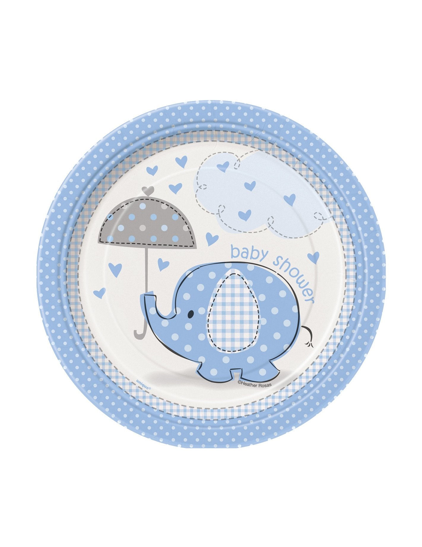 Ez a tétel 8 kis tányérból áll. Körülbelül 18 cm átmérőjűek és kartonból készülnek. Az egyes tányérok közepére egy kis kék elefántot tartanak a trompe -ban. A körvonal kék, fehér pontokkal. Tálalja desszertjeit ezeken a fenséges lemezeken a Baby Shower Boy alkalmával, és a vendégek örömmel fognak! Egyedi márkázási party