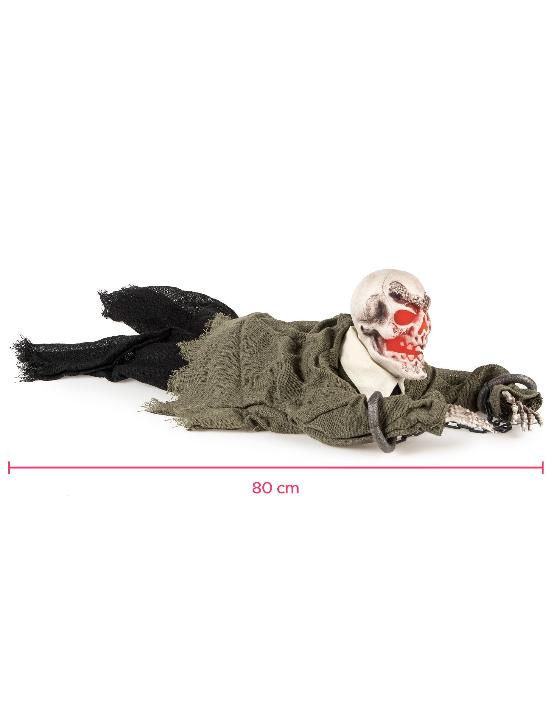 Ez a dekoráció egy csontvázot képvisel, amely mászik. Fekete és zöld hálóba öltözött. A csontváz kezét láncolják. A csontváz mellszoboránál van egy akkumulátor doboz (az akkumulátorok is). Miután a gomb elindult, a csontváz zajt fog okozni, a koponya belseje felgyullad, és karjai mozognak, hogy azt a benyomást keltsék, hogy a rámpás csontváz. Ez a dekoráció körülbelül 80 cm hosszú. Ez a mászó csontváz tökéletes lesz a baljós dekoráció befejezéséhez a Halloween estén. Copyright Widmann SRL