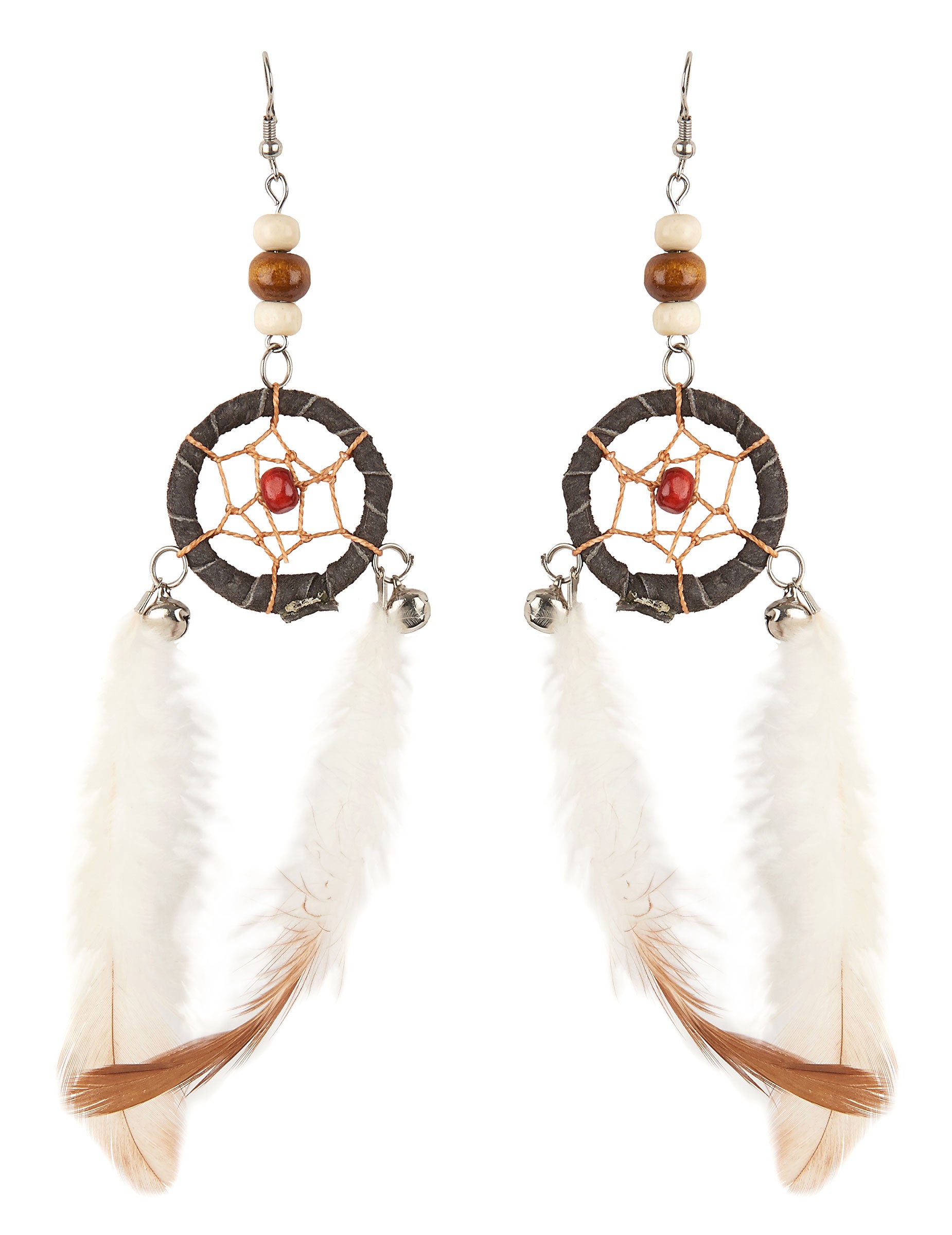 Ezek a felnőtt fülbevalók az indiai álomfogásokat képviselik. Fehér és barna tollakat, valamint harangokat lógnak a fürtökön. Ezeknek a fürtöknek átszúró fülük van. Ezek a göndörök tökéletesek lesznek egy indiai jelmez kitöltésére a karneválra vagy egy nyugati estére.